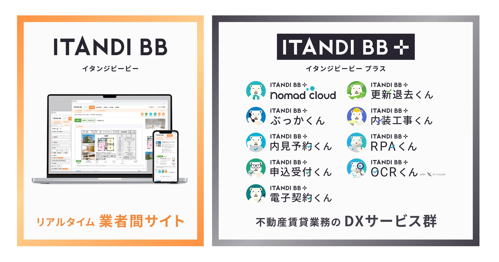 ITANDI BB +は、物件検索から内見、入居申込、契約、更新、退去手続きまでを一気通貫でサポートし、顧客管理機能も有する、不動産賃貸業務のDXサービス群です。withコロナ時代の新たな生活様式に対応した賃貸不動産業務の実現を推進し、現在、約3,000店舗の管理拠点で導入、約47,000店舗の仲介拠点で利用されています。