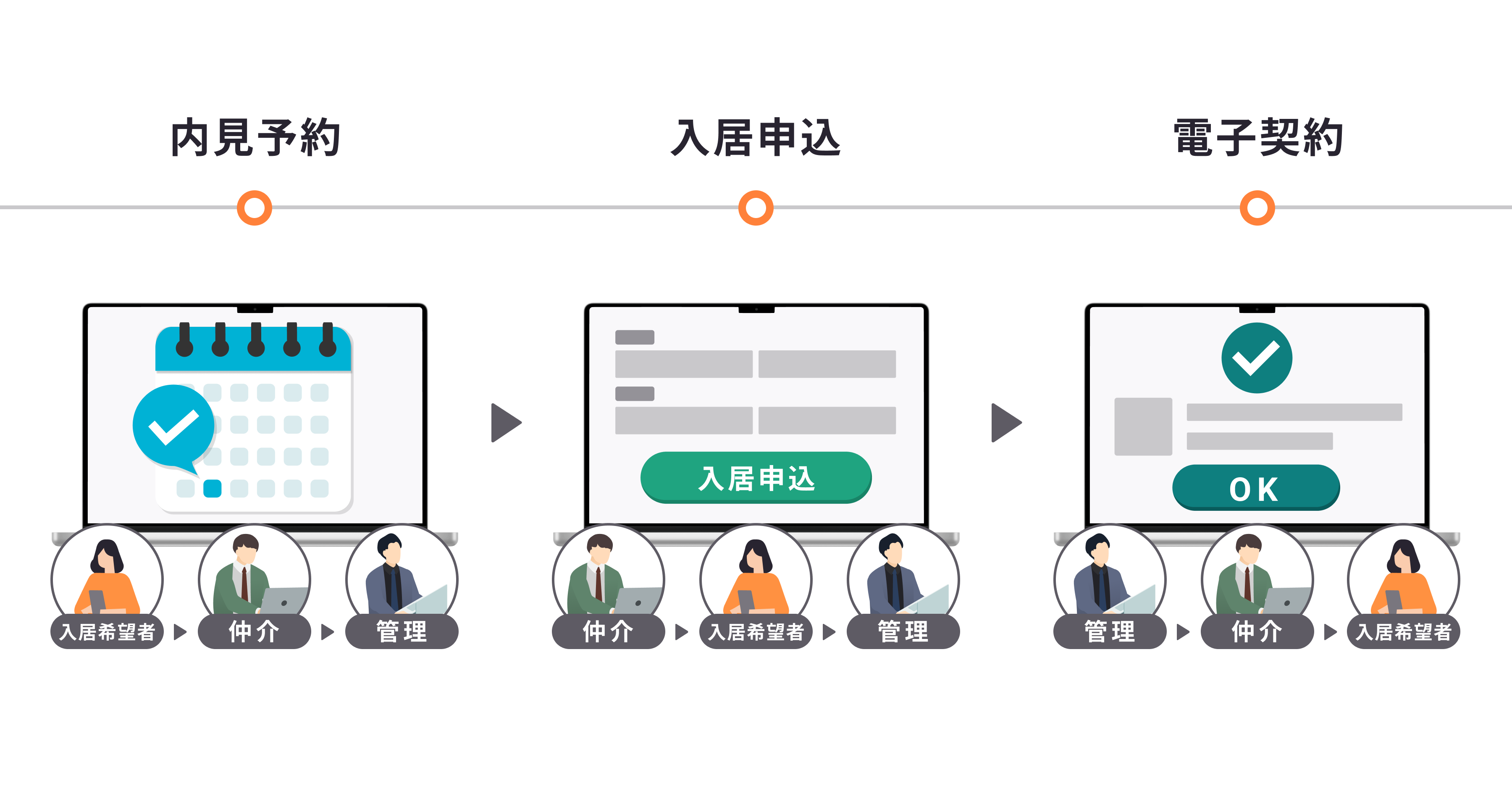 これにより、アーキテクト・ディベロッパーは内見予約、入居申し込みから賃貸借契約までの一連の手続きをオンライン完結し、なめらかな賃貸借契約を実現します。