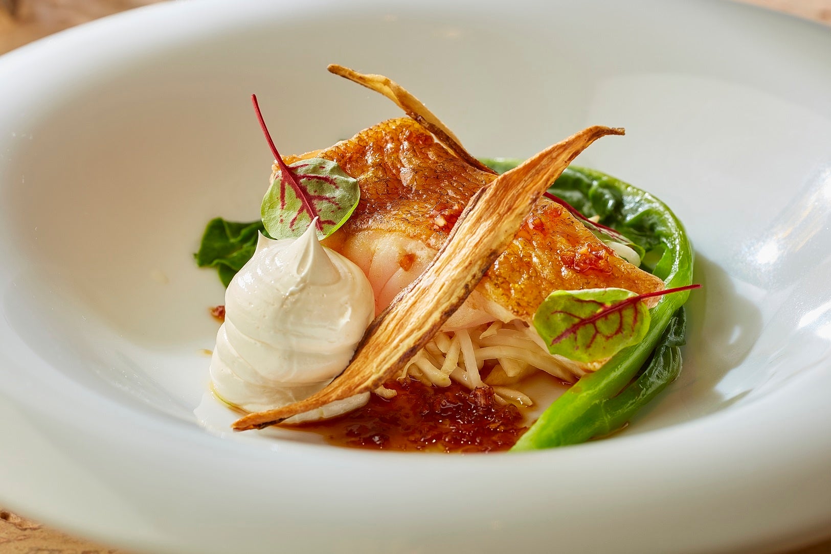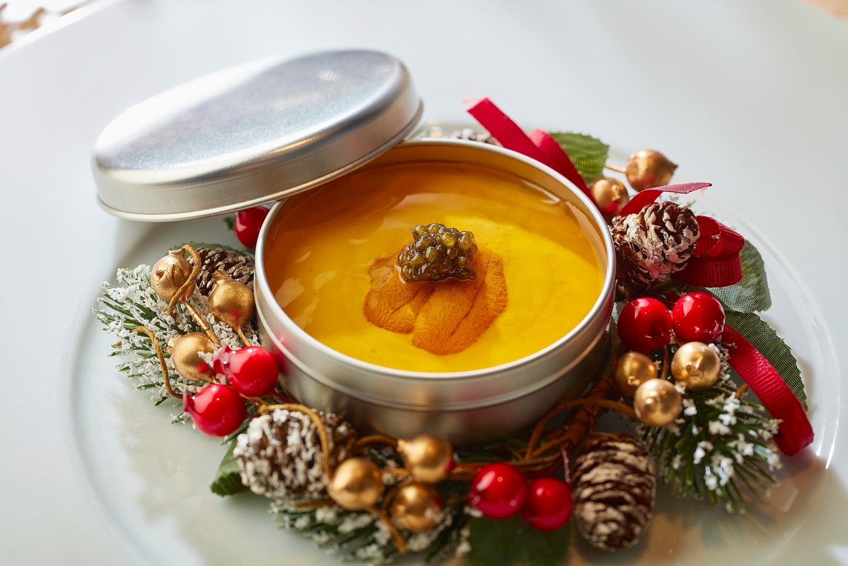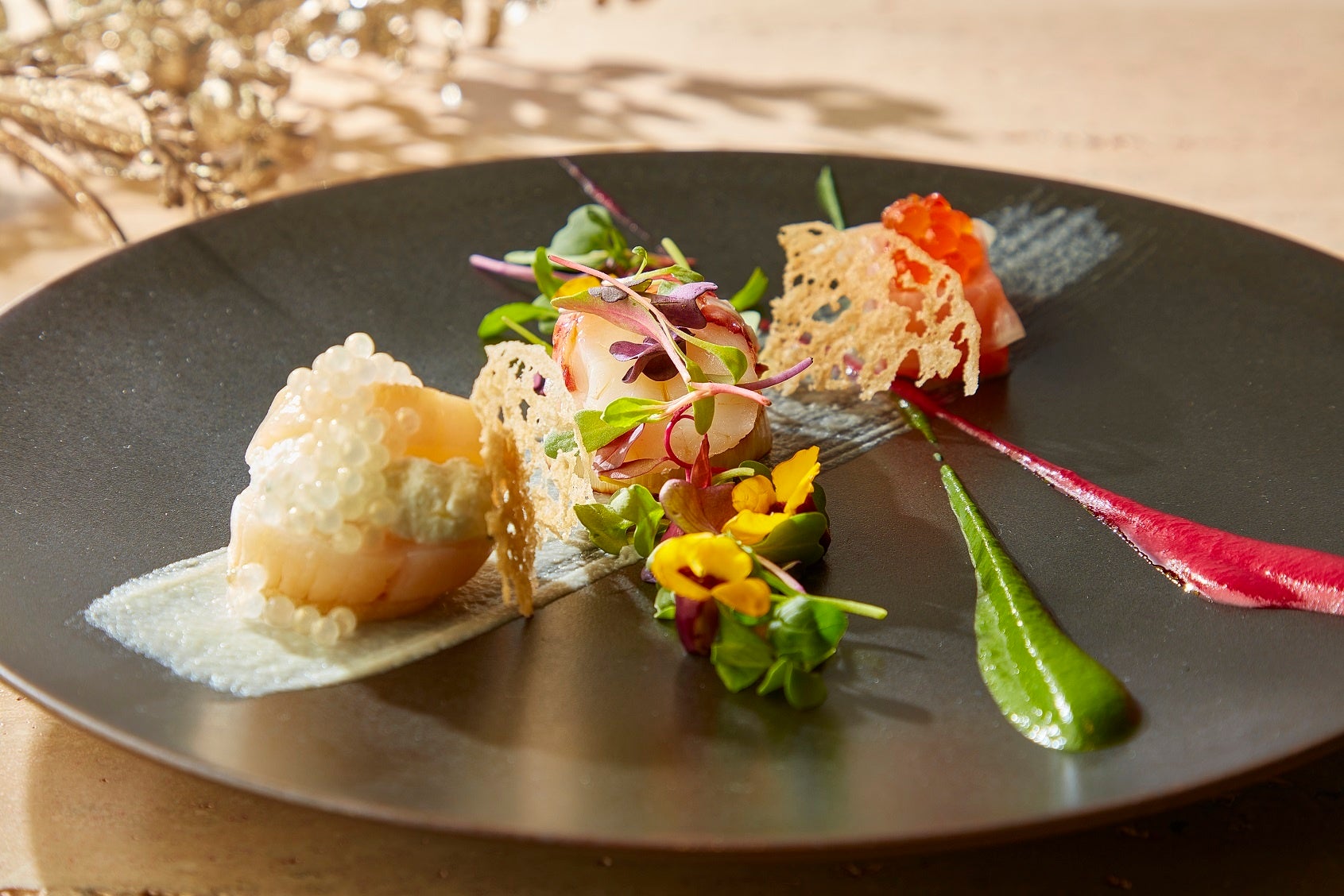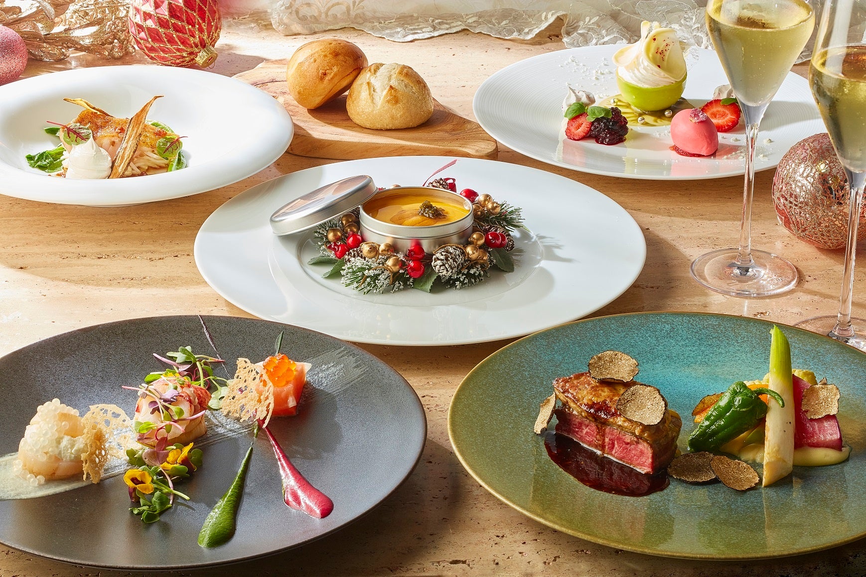 Fish Bank TOKYOで長年愛されているスペシャリテ「ウニのフラン」をリース仕立てのクリスマススタイルにした一皿から、前菜はオマール海老や新鮮なイクラなどFish Bank TOKYOらしい海の幸を使用した3つの饗宴スタイルで、お魚料理は冬の高級魚のハタを香ばしく焼き上げた食べ応えのある1皿に、