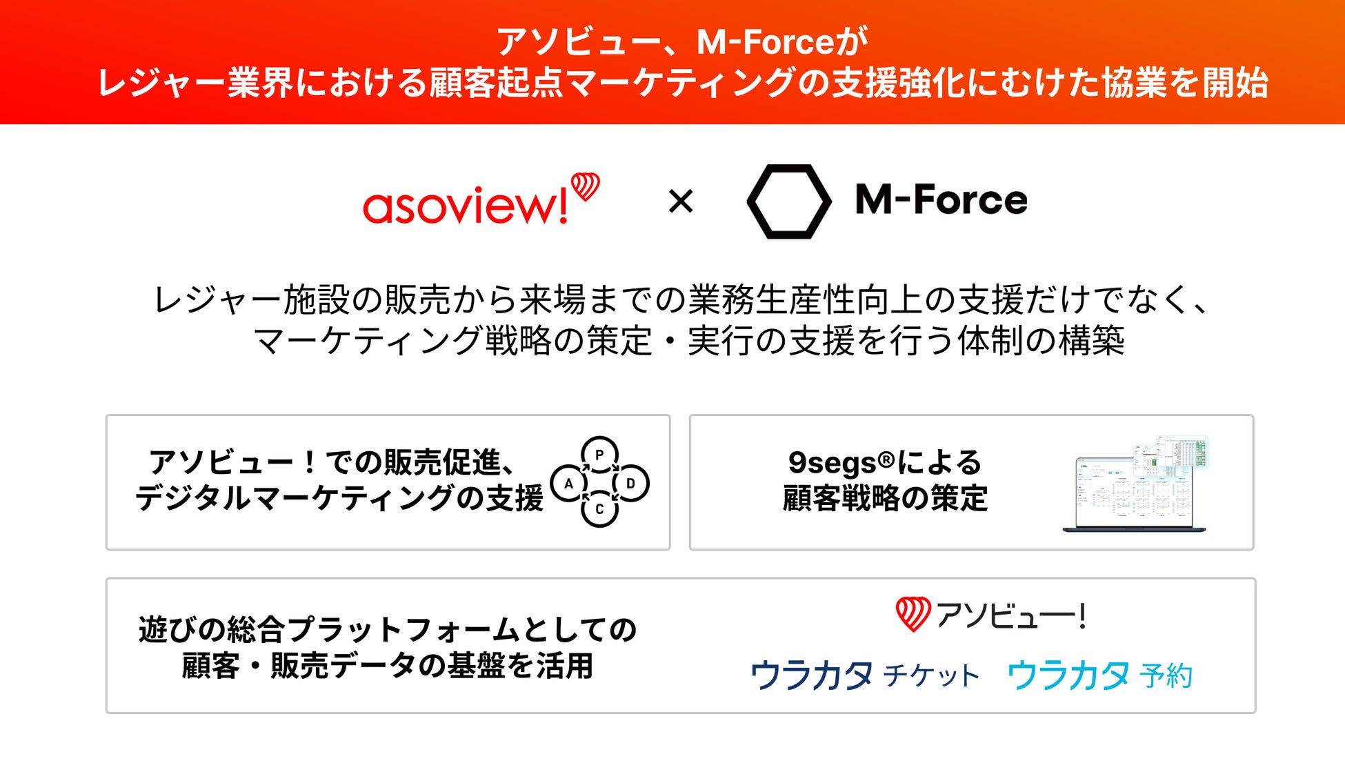この協業により、当社が運営する「アソビュー!」、「ウラカタ」の顧客データ・購買データと、M-Force独自の顧客戦略の策定とPDCAを導くフレームワーク『9segs®︎』と掛け合わせることで、レジャー業界に対し、より効果的で再現性の高いマーケティング支援を行うことにより、サスティナブルな施設運営をサポートいたします。