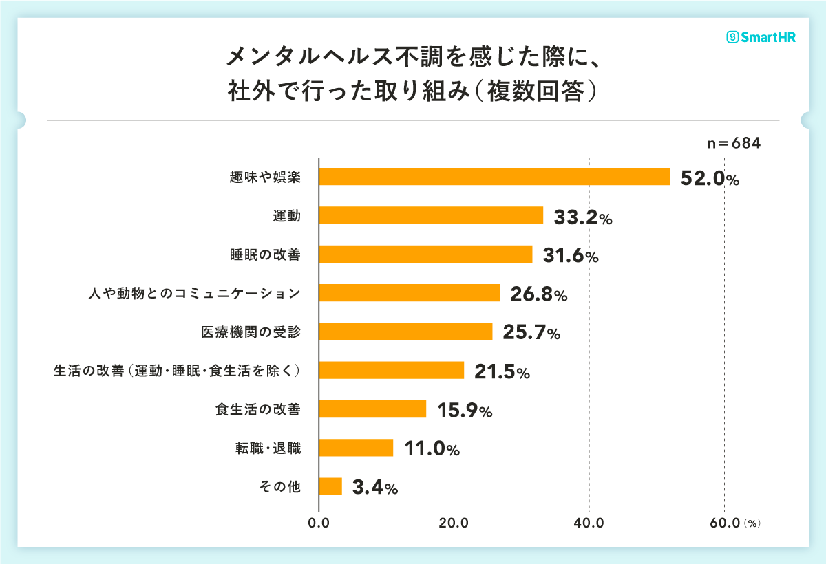 メンタルヘルス不調を感じた際に社外で行った取り組みを問う設問では、52.0%が「趣味や娯楽」を選択し、ついで「運動」が33.2%、「睡眠の改善」が31.6%と続きました。一方で、「生活の改善」や「人や動物のコミュニケーション」など多くの選択肢が20%を超えており、複数の選択肢を柔軟に選べることの重要性が伺えます。