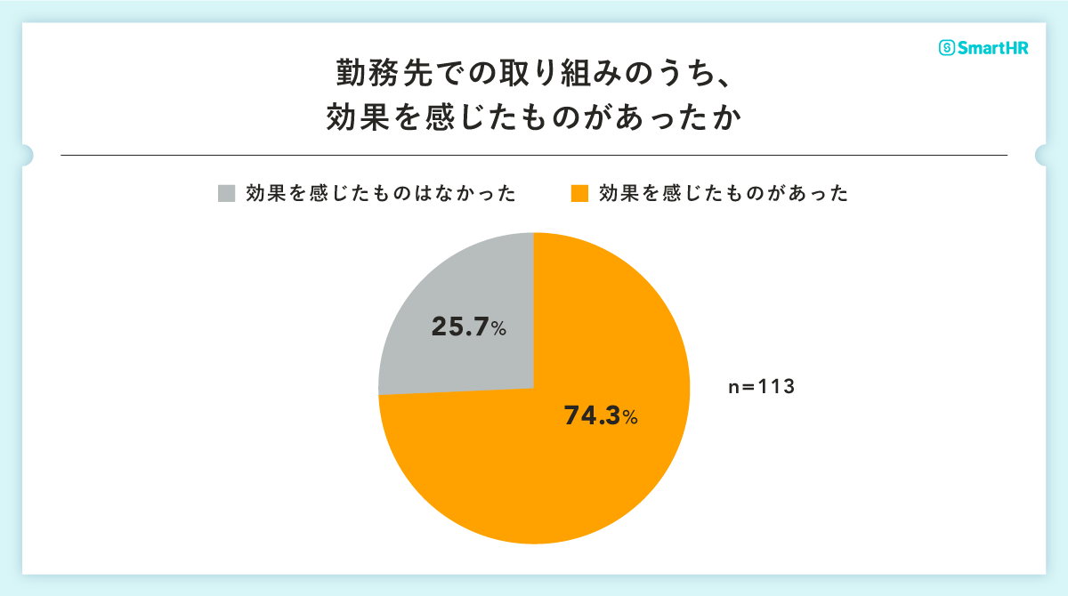 一方で、「取り組みがあり、利用したことがある」と回答した人に、メンタル不調の改善のために利用した・行った社内での取り組みの効果の有無を聞いた質問では、約75%が効果があったと回答しています。