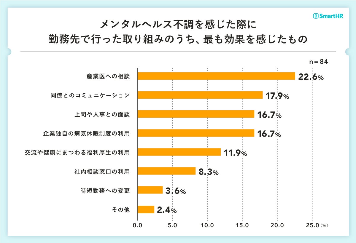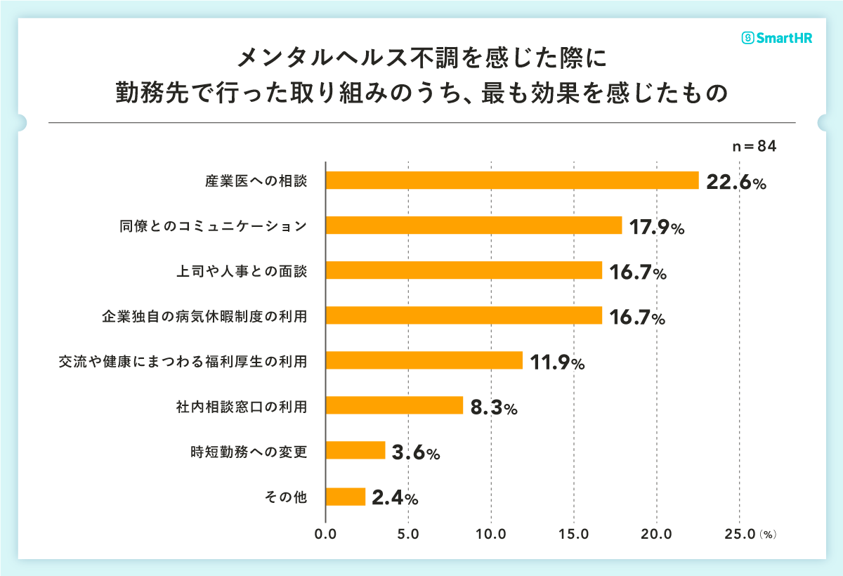 もっとも効果を感じた取り組みは「産業医への相談」で22.6%となりましたが、大きくポイント差が出た取り組みはなく、それぞれに合った取り組みが選択できる環境の柔軟さが求められることがわかります。