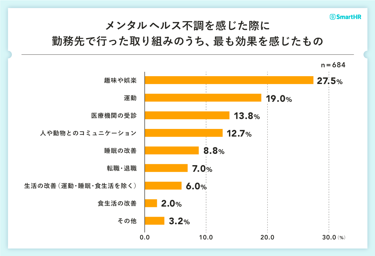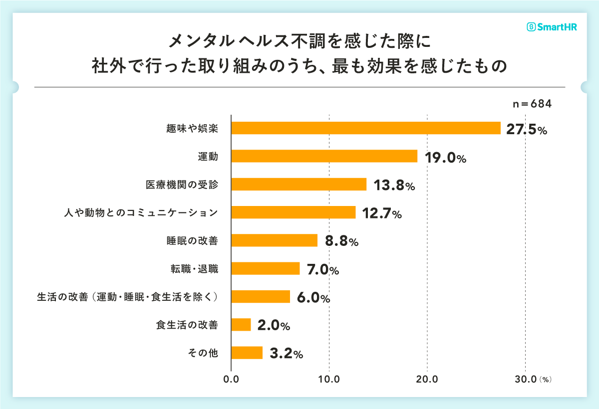 また、行った社外での取り組みのうち、もっとも効果を感じたものを聞いたところ、「趣味や娯楽」が27.5%を占める結果になりました。業務から一定の距離を取った、自分らしさと関わる取り組みに改善の効果を感じやすいといえます。
