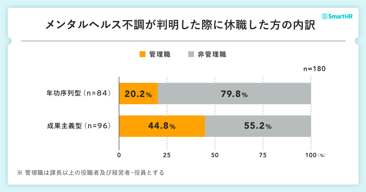 また、休職された経験のある方を給与制度および管理職・非管理職で分けたところ、年功序列型は約20%が管理職、約80%が非管理職だったのに対して、成果主義型は管理職が約45%、非管理職は約55%と給与制度で分布に違いが見られました。
