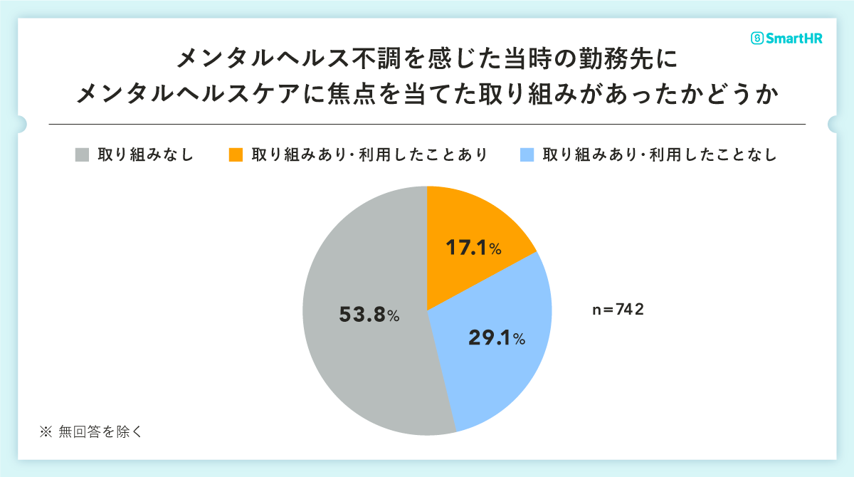 メンタルヘルス不調を感じた当時の勤務先にメンタルヘルスケアに焦点を当てた取り組みがあったかを問う設問では、半数を超える53.8%が「取り組みはなかった」と回答しました。