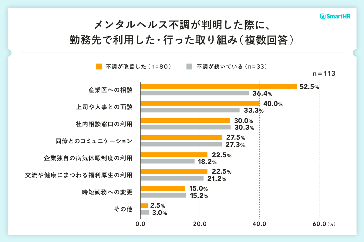- 産業医への相談・上司との面談を行っている人のほうが改善する割合が高い