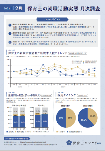 | ~ 3つのポイント ~ 1. 保育士就職・転職市場において、有料職業紹介を利用している求職者数と求人数の推移を計測。12月は、新規求職者は減少(東京23区においては計測上、最も低い値)し、新規求人数は増加するといった先月(11月)と同傾向にある。 2. 雇用形態別で見ると2022年10月~12月は先月に比べ大きな変動はないが、求人においては正規雇用である正社員の募集が増加するなか、対求職者においては非正規雇用である契約社員・パートで働きたいという比率(※トータルで算出した場合)が増加している。 3. 採用タイミングについては、次年度採用の比率が60%を超え、全国にある保育施設の多くが「すぐの採用」ではなく、次年度の人材確保に向けた採用活動にシフトチェンジしている。 |