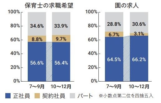 *2022年10〜12月保育士バンク!の利用実績をもとに、直近3か月の保育士求職者の希望と園の募集要件で、正社員・契約社員・パートの雇用形態の割合を算出、 前期間と比較。
