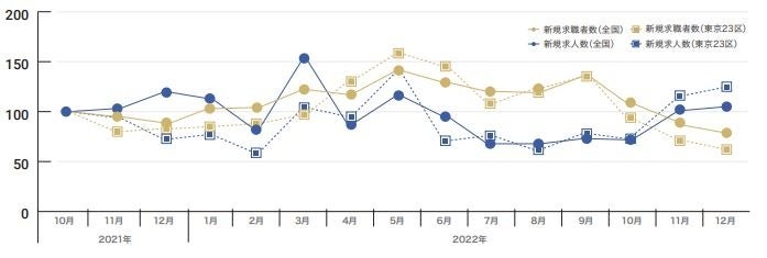 12月、東京23区の新規求職者数は昨年同月より減少するも、新規求人数は大幅に増加。次年度採用については6割超の法人が本格化