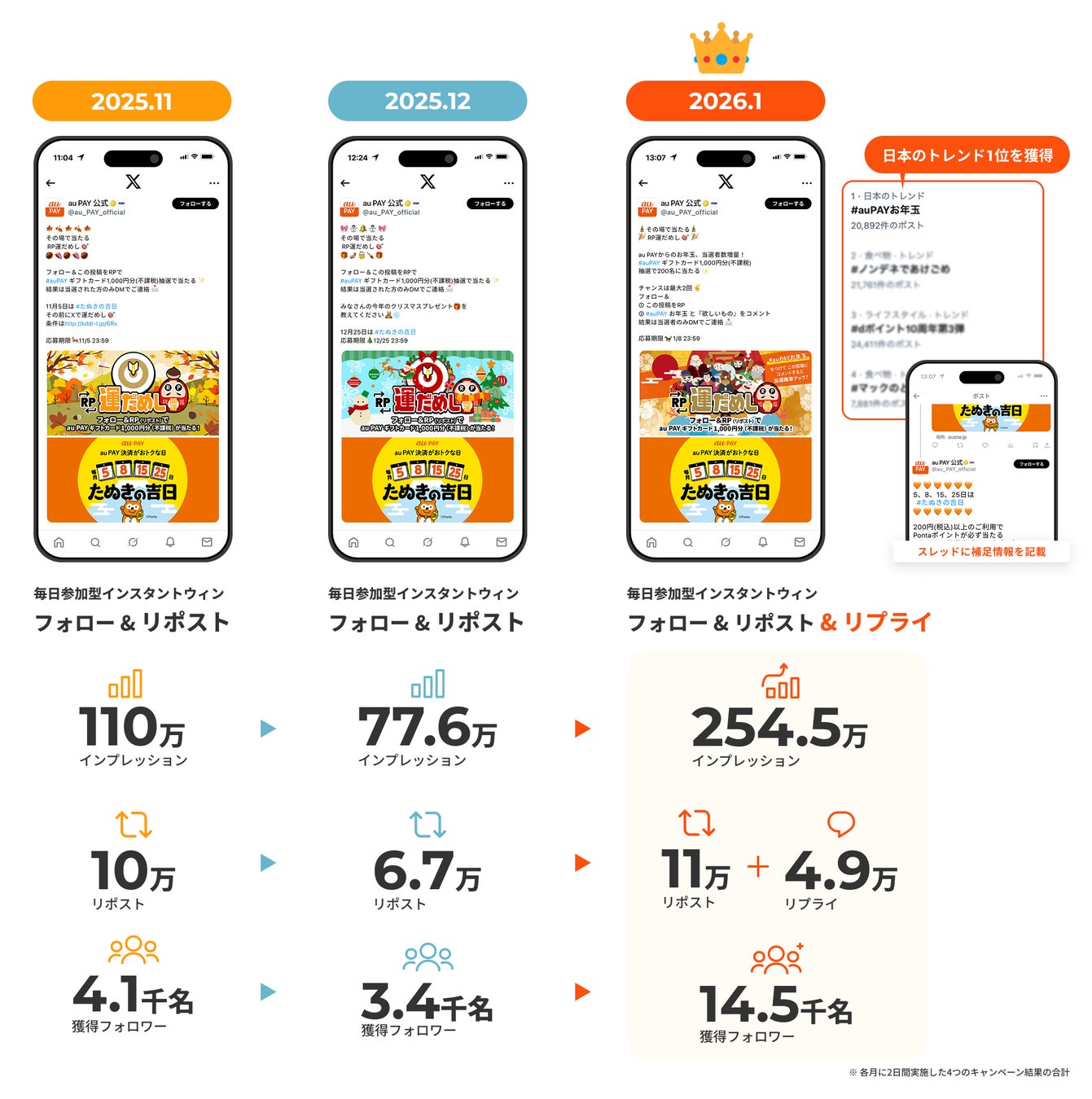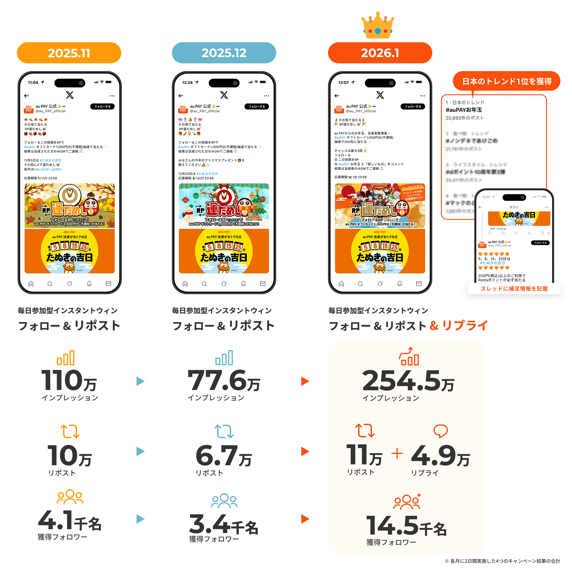 主な目的は従来と変わりませんが、X (Twitter) アルゴリズム変更に対応するために、インプレッション数・フォロワー数・エンゲージメント数の向上を狙ったキャンペーン設計へと改善しました。