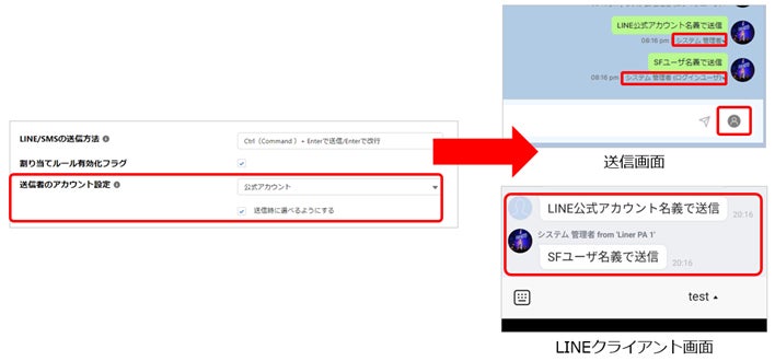 Salesforce上から1:1のチャットでメッセージを送る際に、これまでLINE公式アカウントの表示名でメッセージを送信していましたが、「送信者のアカウント設定」で機能を有効化することで、送信時に現在のSalesforceのログインユーザーの表示名または別途設定した任意の表示名で送信することが可能になります。LINE公式アカウント(企業としての顔)としてだけでなく個人の顔が見える対応が可能となることで、エンドユーザーは企業側の担当者をより身近に感じることができ、顧客満足度やロイヤルティの向上に繋がる可能性があります。