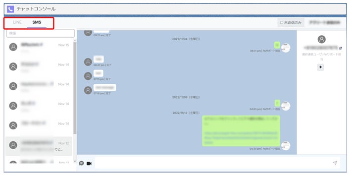 LINEのみに提供していたチャットコンソールの機能をSMSでもご利用いただけるようになり、1つの画面上で複数のエンドユーザーとのメッセージのやりとりが可能になりました。また、LINEとSMSの両方をご利用いただいている場合には、タブをクリックすることでLINEとSMSのコンソールを切り替えることができるようになります。