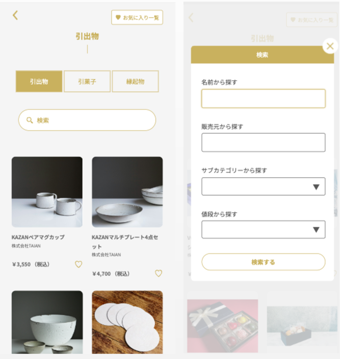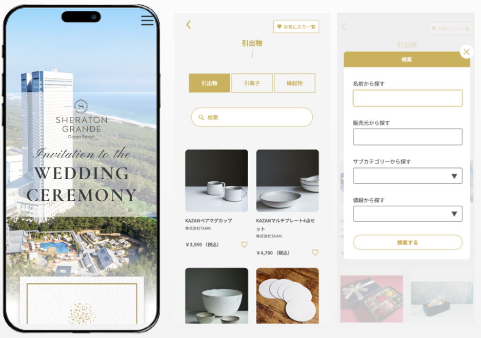 検索機能を使ってカテゴリーや予算から探せるなど、ECサイトのような感覚でアイテムを選択できるほか、親族、友人などグループ毎の「引出物セット」作成、席次表割当ても可能です。