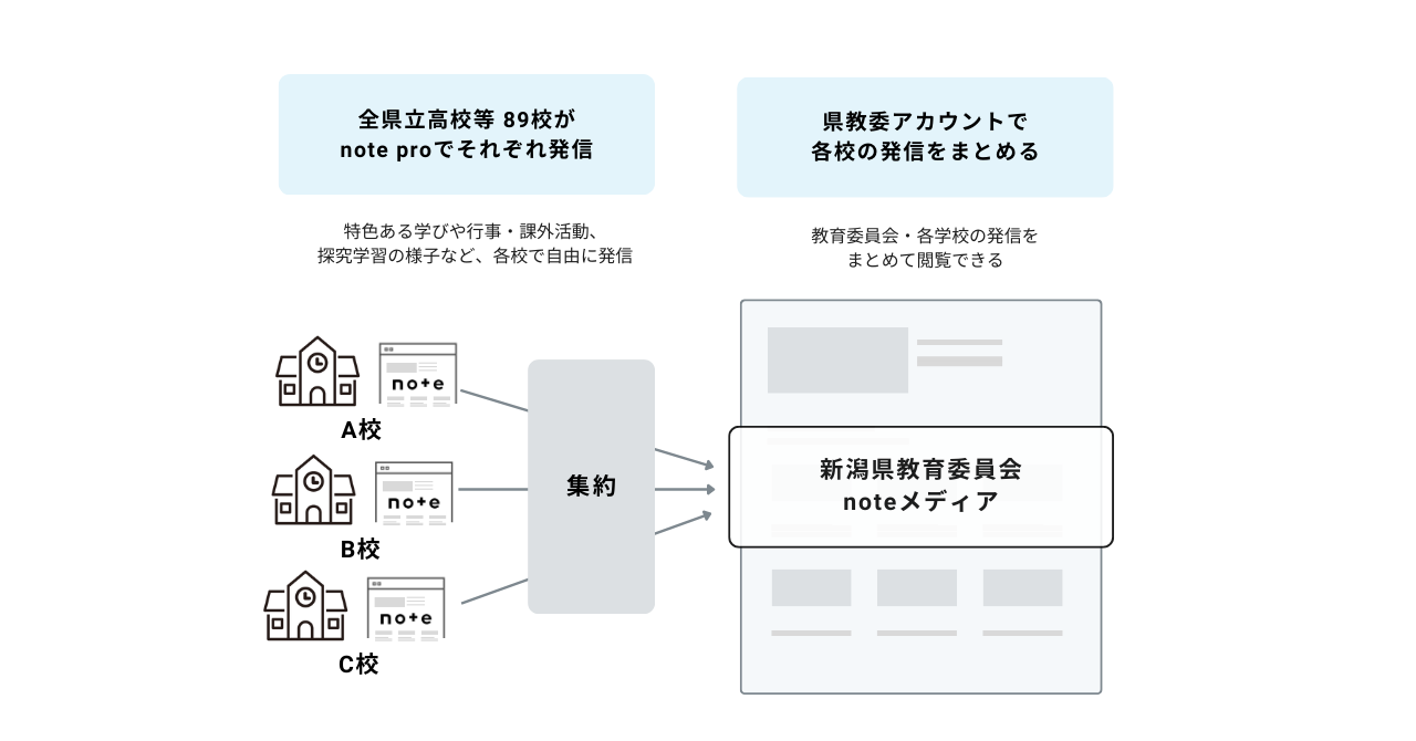 そこで今回、note社と連携協定を締結。全県立高等学校・中等教育学校89校がnoteのアカウントを開設し、県教委が各学校のnoteの記事をまとめるオウンドメディアをnote上に構築することになりました。