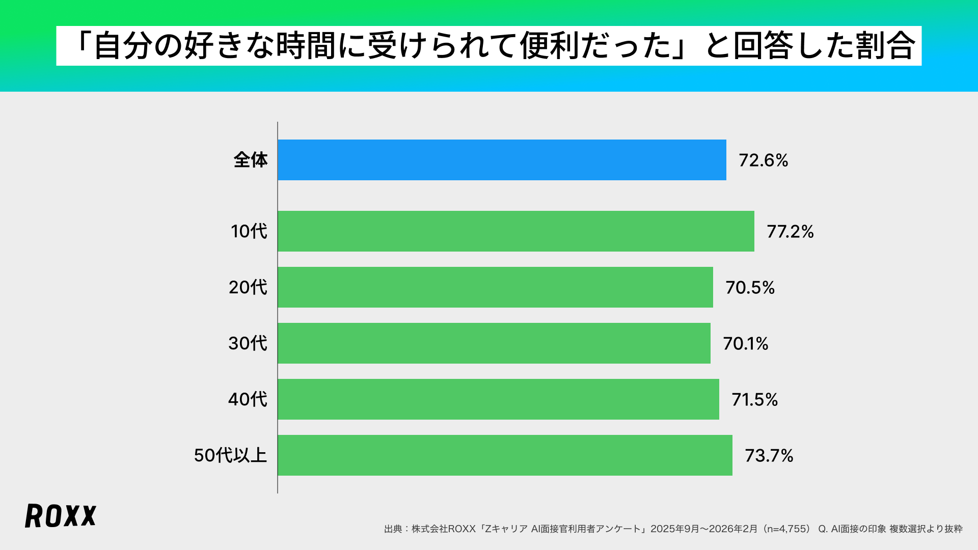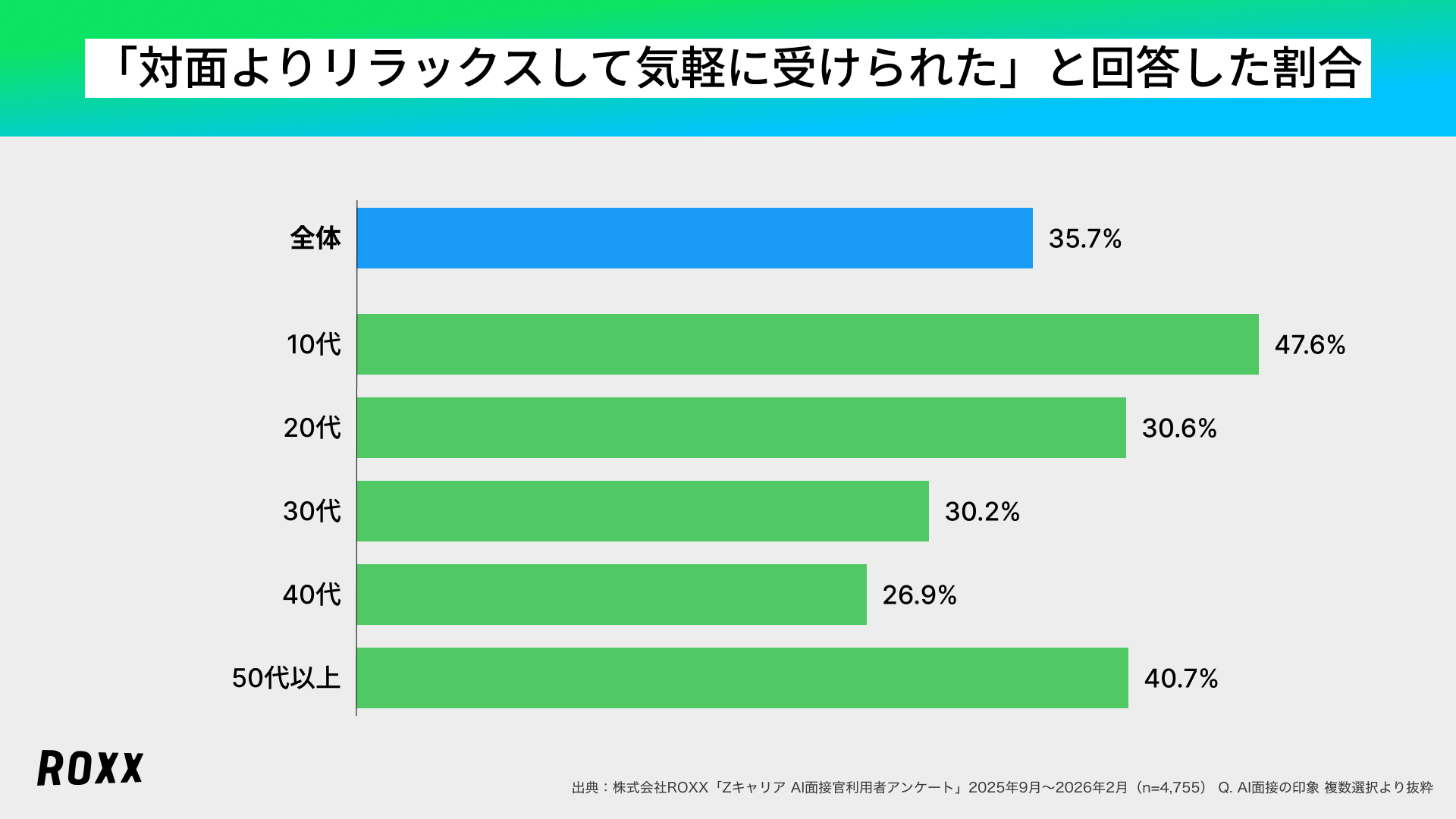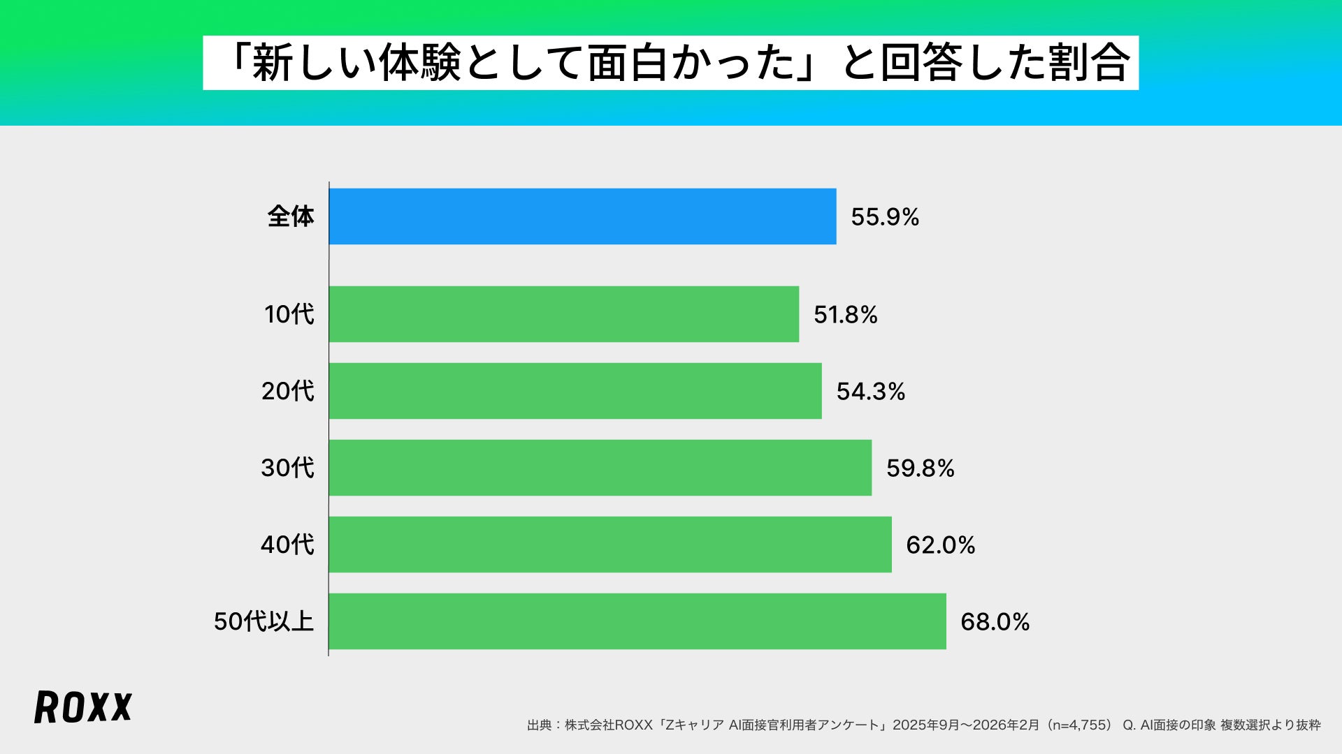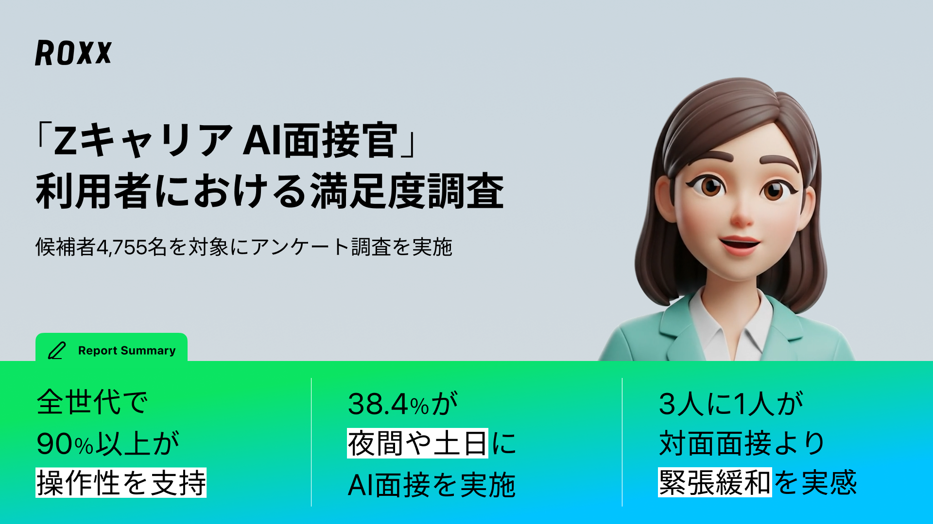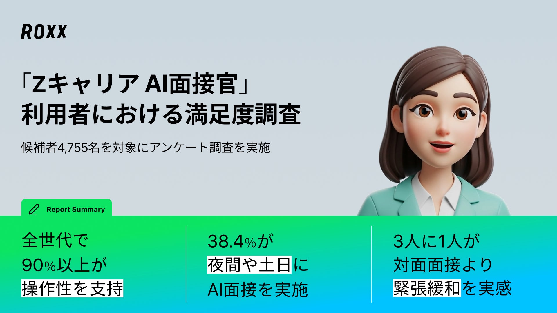 日本全体の所得向上の実現を目指し、労働市場の需給ミスマッチをテクノロジーで解決する株式会社ROXX(本社:東京都新宿区、代表取締役社長:中嶋汰朗、東証グロース:241A、以下 ROXX)は、自社が開発・提供する採用支援サービス『Zキャリア AI面接官』を利用して選考を受けた候補者4,755名を対象にアンケート調査を実施し、「AI面接の利用満足度に関する実態」を分析しましたので、その結果を報告いたします。