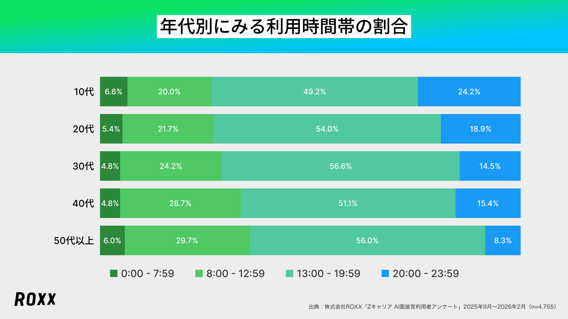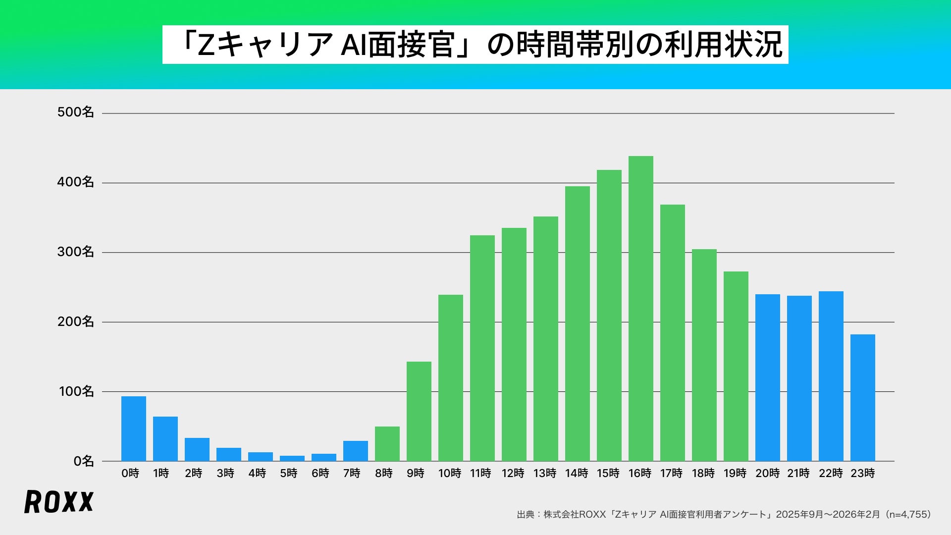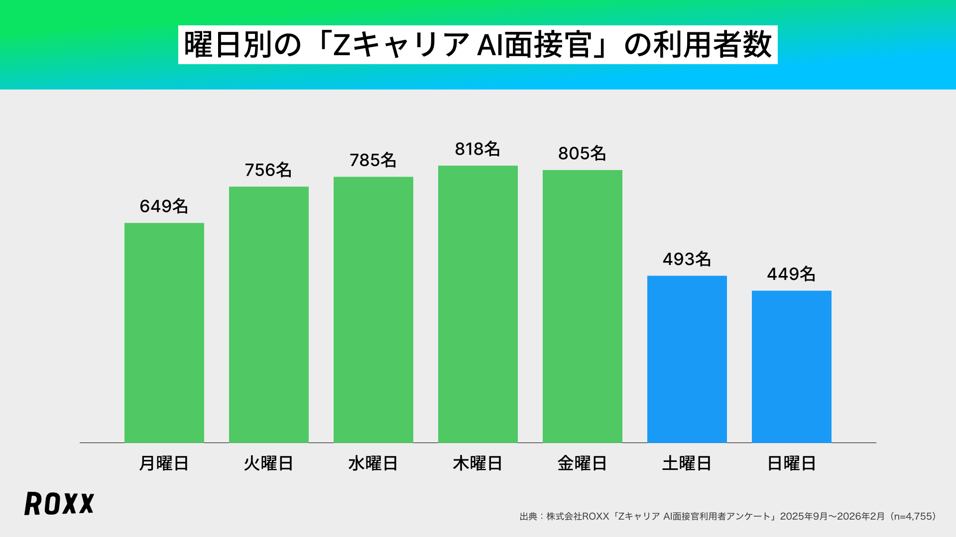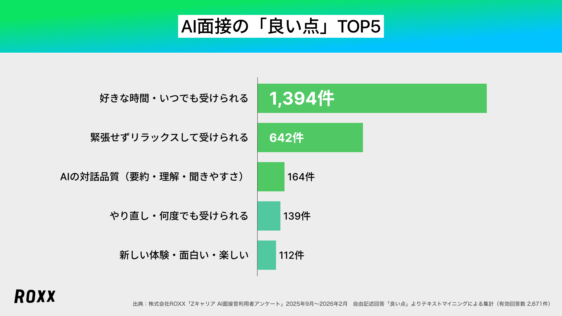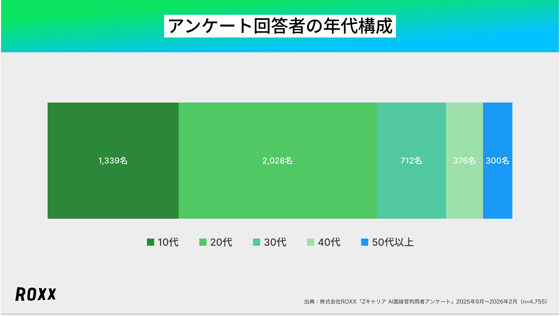 日本全体の所得向上の実現を目指し、労働市場の需給ミスマッチをテクノロジーで解決する株式会社ROXX(本社:東京都新宿区、代表取締役社長:中嶋汰朗、東証グロース:241A、以下 ROXX)は、自社が開発・提供する採用支援サービス『Zキャリア AI面接官』を利用して選考を受けた候補者4,755名を対象にアンケート調査を実施し、「AI面接の利用満足度に関する実態」を分析しましたので、その結果を報告いたします。