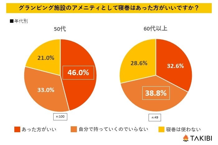 年代別で見ると20代・30代・40代・50代は「あった方がいい」と思う方が多く、60代以上では「自分で持っていくのでいらない」と思う方が多く、4割程という結果になりました。