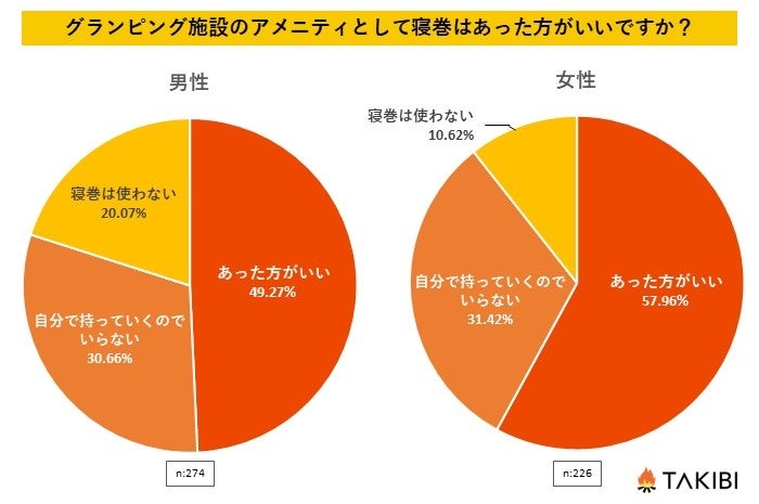 このことから、女性は日中の服装で悩み、その対策として余分に服を持参する方がいるため、寝巻に関しては施設のアメニティとして用意されているものを使用したいと思う方が多くなったのではないかと推測します。