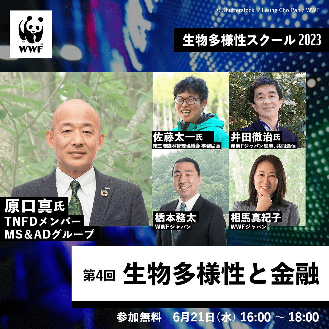 世界経済フォーラムによれば、世界のGDPの50%以上(44兆米ドル)は、自然環境や生物多様性に大きく依存し、その危機はあらゆる産業部門の企業や投資家にとって、大きなリスクとなります。そうした中、世界では気候変動分野での先行事例を踏まえ、企業と自然環境の関わり、リスクや機会等について情報開示を促す枠組み「自然関連財務情報開示タスクフォース(TNFD)」の策定が進んでいます。TNFDタスクフォースメンバー原口真氏をお招きし、生物多様性と金融、企業の情報開示等について考えます。また、宮城県でFSC認証林の経営に取り組む、南三陸森林管理協議会の事務局長佐藤太一氏も迎え、林業の現場から見た自然関連の情報開示についてもお伺いします。WWFジャパンからは金融グループ長の橋本務太、森林グループ長の相馬真紀子が、国際環境NGOの役割についてお話します。