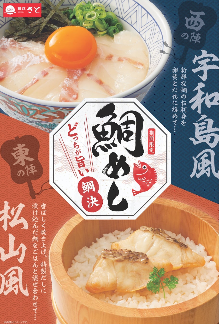 今回この2種類の鯛めしを和食さと風にアレンジし、刺身をヨード卵・光の卵黄と特製たれに絡めて食べる「宇和島風 鯛めし」と、鯛を香ばしく焼き上げて特製だしに漬け込み、ご飯と混ぜて食べる「松山風 鯛めし」の対決企画として販売します。