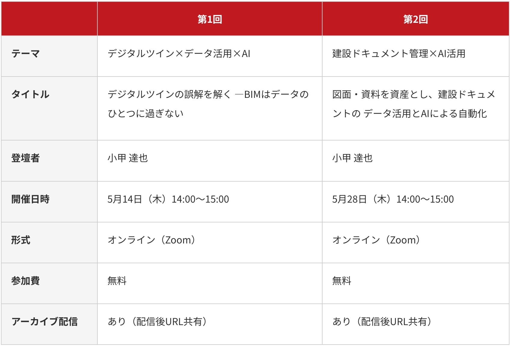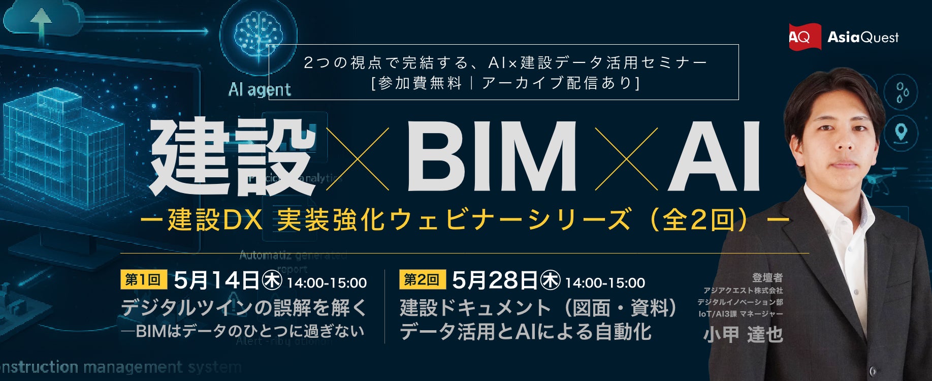 アジアクエスト(東京都文京区)は、建設業を対象とした全2回のウェビナーシリーズを下記の通り開催いたします。「BIMデータ活用」と「建設ドキュメント管理」という2つの視点から、建設業におけるAI×データ活用の全体像を体系的に解説する連続講座です。大手ゼネコンのDXプロジェクトを牽引してきた実績を持つ小甲達也が両回に登壇し、BIM・デジタルツイン・ドキュメント管理における実践的なデータ活用とAI導入について解説します。