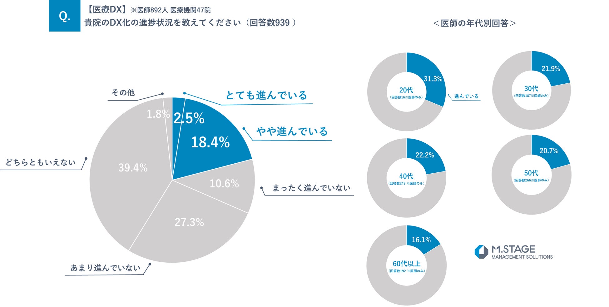 DX化の進捗状況が「とても進んでいる」と回答した医師・医療機関は2.5%、「やや進んでいる」と回答した医師・医療機関は18.4%となり、DX化が進んでいると回答した医師・医療機関は約2割に留まる結果となりました。また、医師の回答を年代別にみると、20代の「進んでいる」割合が一番高く31.3%となりました。反対に、一番低い割合となったのが60代以上で16.1%という結果となりました。
