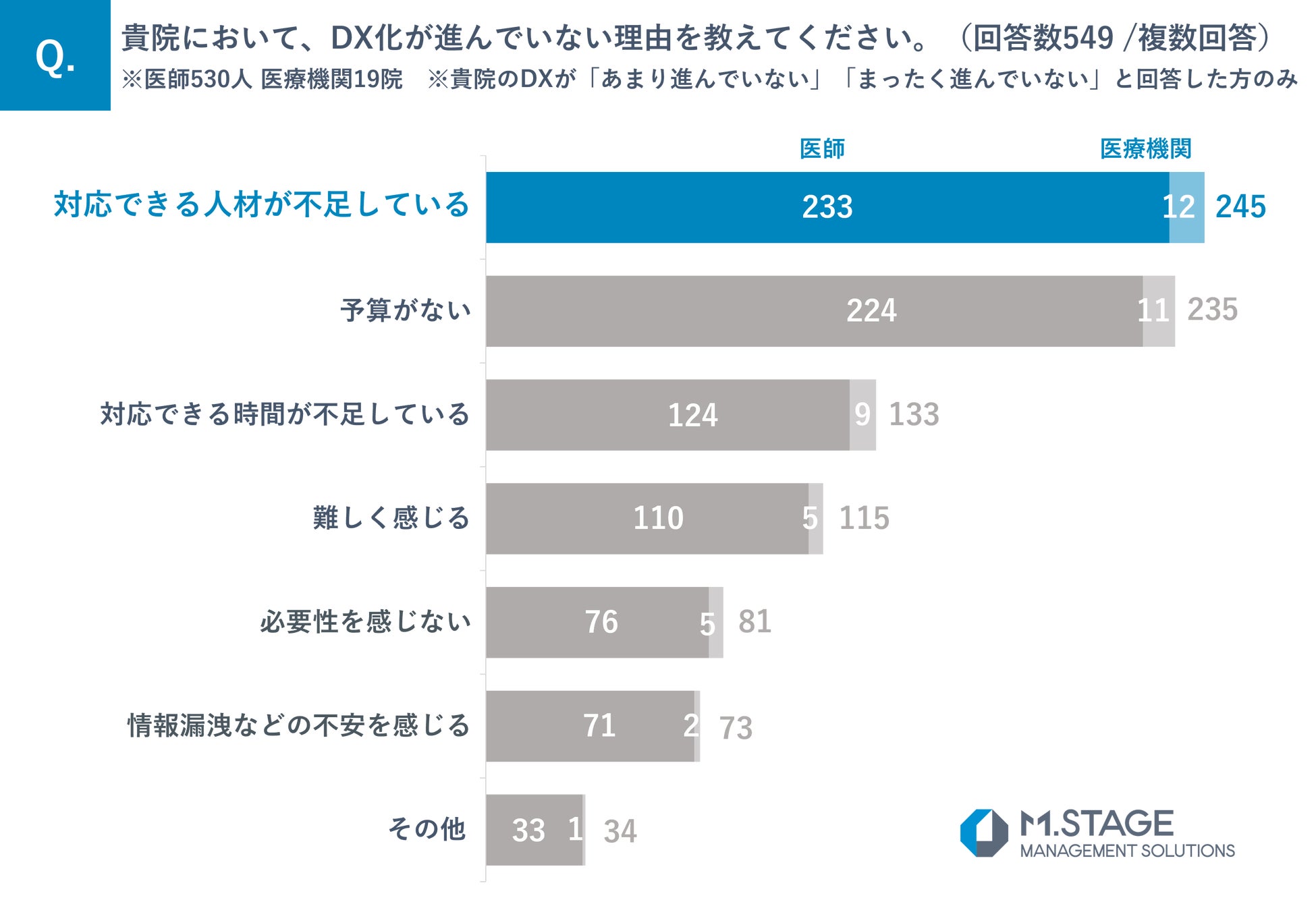 医療DXが進んでいない理由について、「対応できる人材が不足している」(245)が最も多く、次いで「予算がない」(235)、「対応できる時間が不足している」(133)が続く結果となりました。