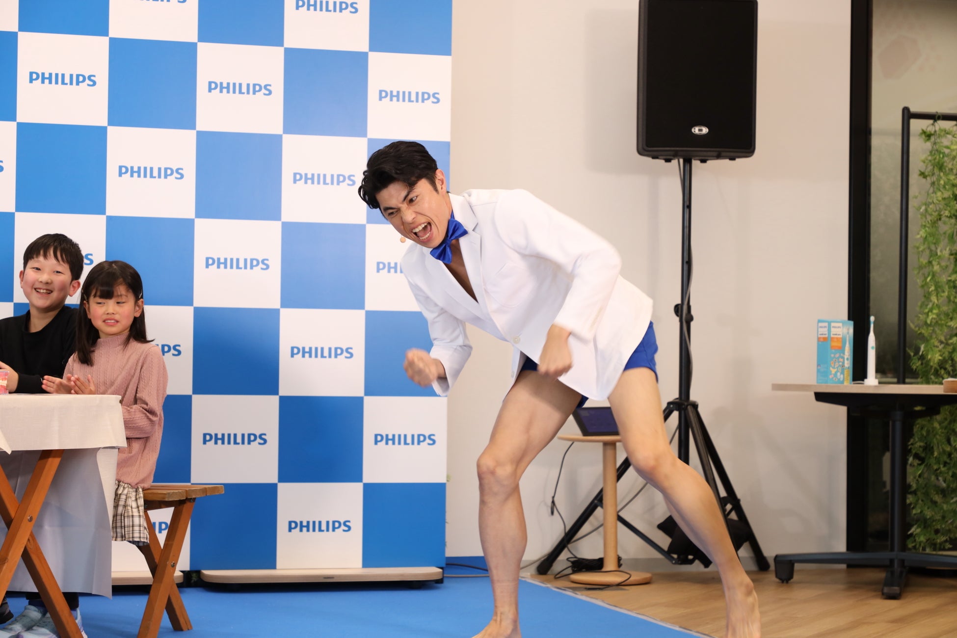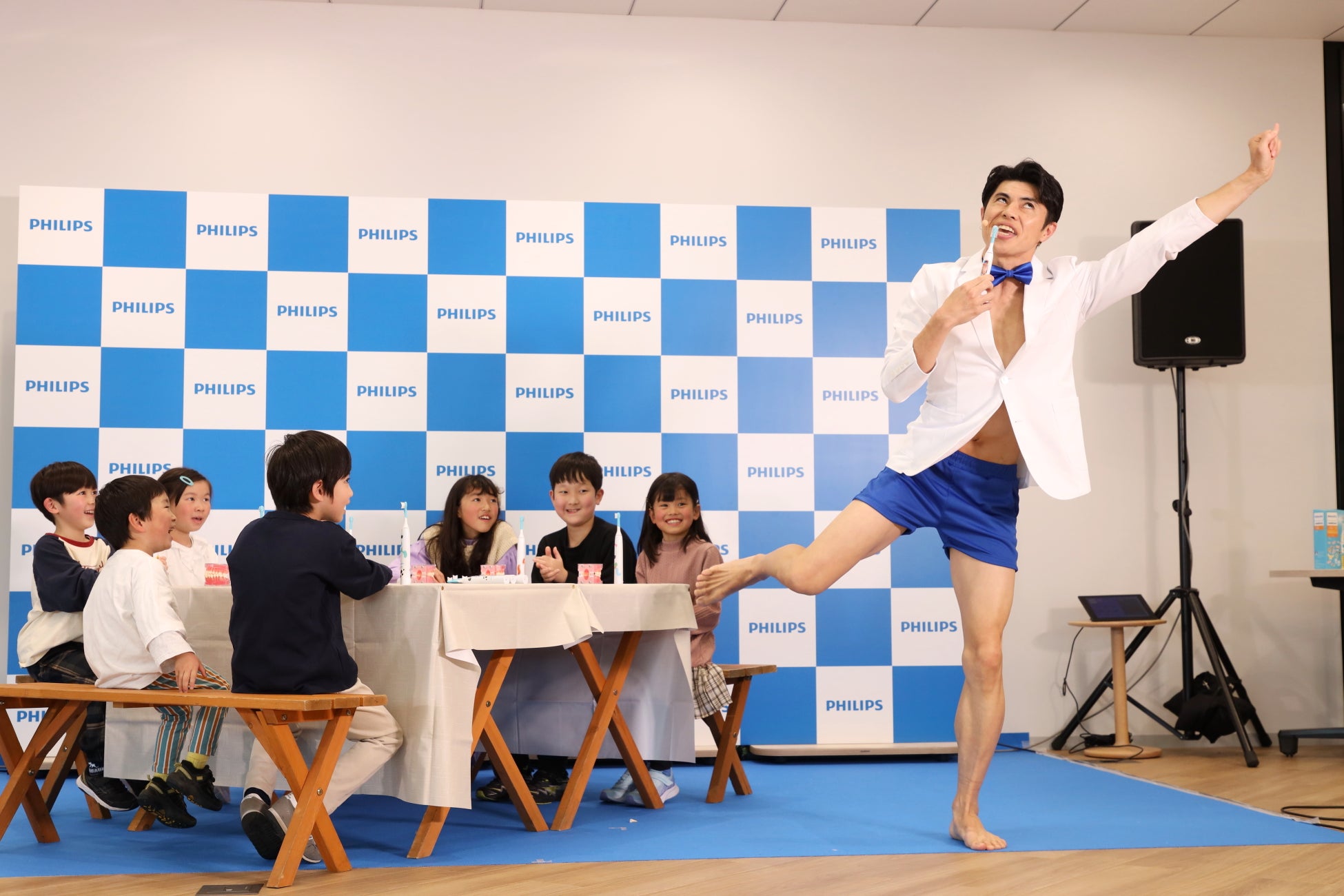 「フィリップス ソニッケアーキッズ新製品発表会」を開催 特別ゲストとして小島よしおさんが登場し、子どもたちに正しい歯磨きを楽しく教える「おっぱっぴー歯磨き」を披露