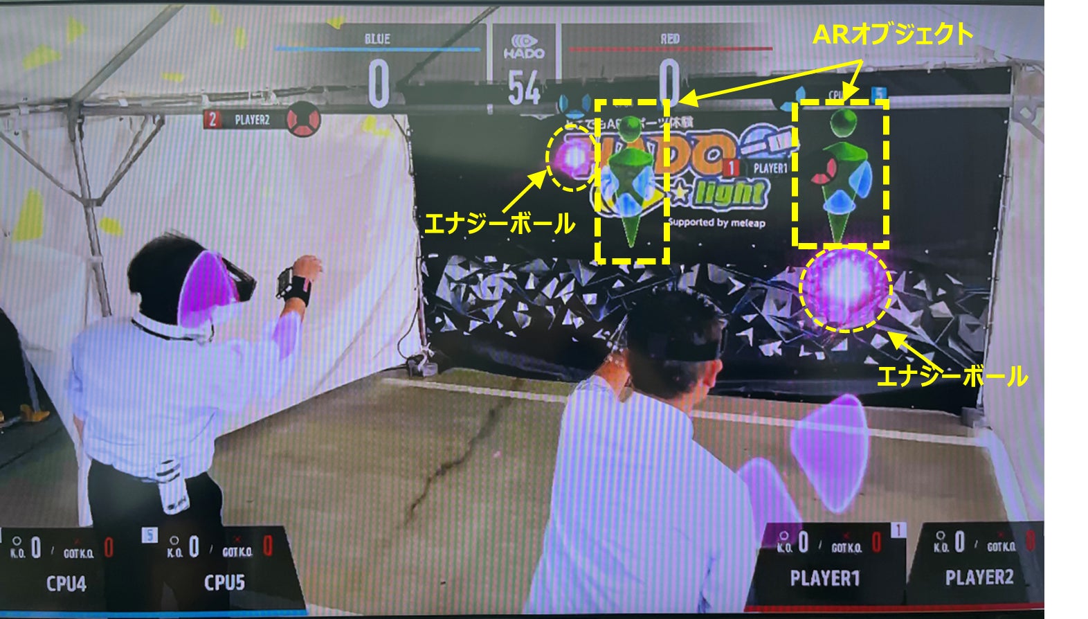「HADO」は頭にヘッドマウントディスプレイ、腕にアームセンサーを装着して対戦するARスポーツです。自らの手でエナジーボールやシールドを発動させ、フィールドを自由に移動し、仲間と連携しながら対戦を楽しみます。