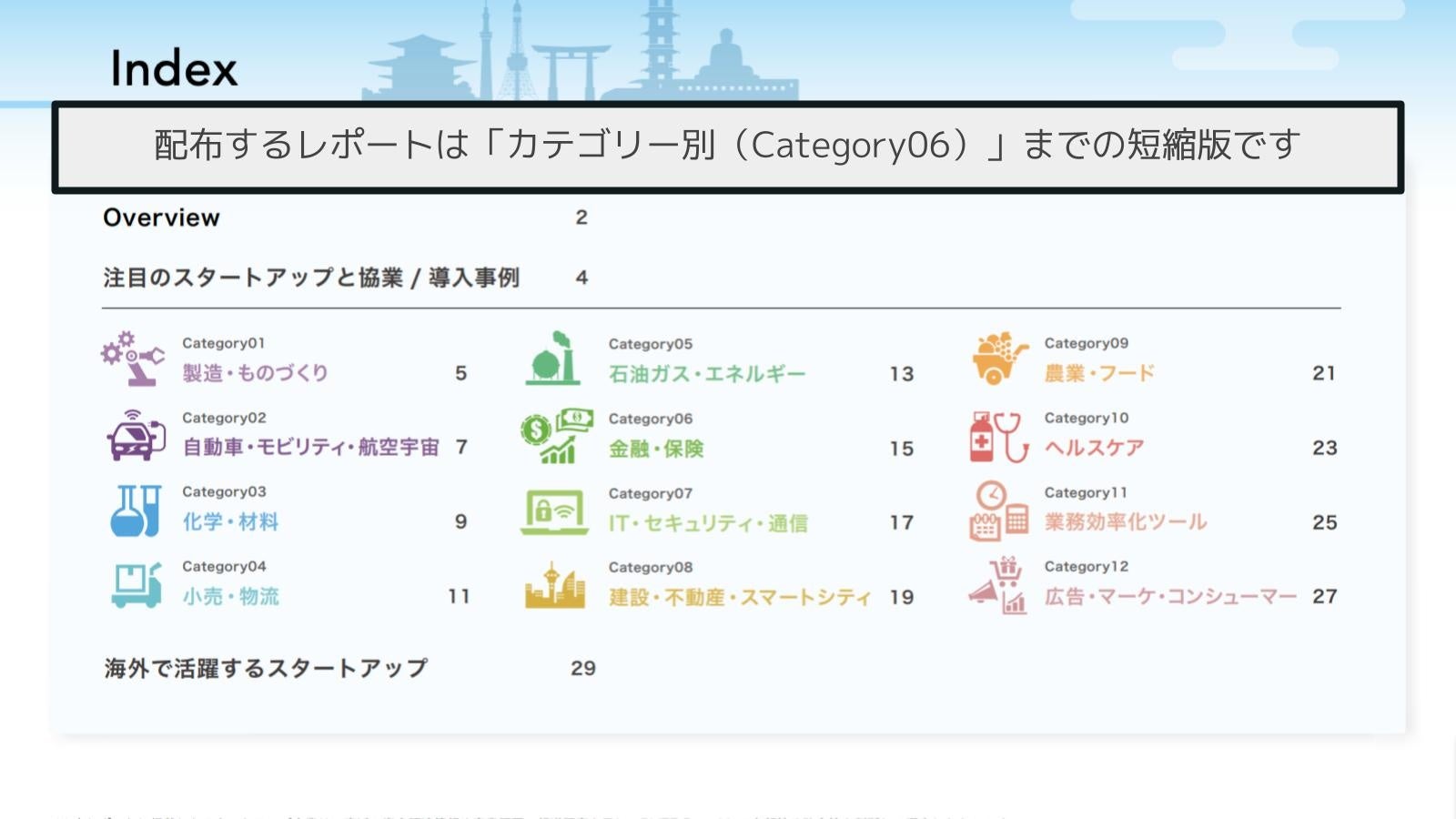 本レポートでは、資金調達の状況や斬新なビジネスモデルなどから今注目しておきたい 日本のスタートアップや大企業との協業事例を、12のカテゴリーに分けて掲載しています。また、後半では海外で活躍する日本にルーツを持つスタートアップをご紹介しています。
