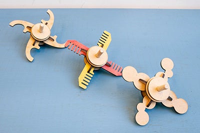 レーザーカッターで切り出したパーツを使って、回して遊べるコマを作ります。羽の形によって回り方が変化する「角運動量」が学べたり、羽に色を塗って、回転させたときに見える色の変化「回転混色現象」が体験できるワークショップです。