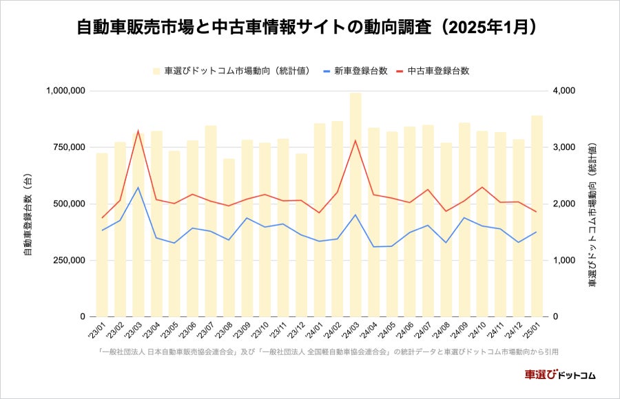 株式会社ファブリカホールディングス(本社:東京都港区、代表取締役社長CEO:谷口政人)の完全子会社、株式会社ファブリカコミュニケーションズ(本社所在地:愛知県名古屋市中区、代表取締役社⻑CEO:⾕⼝ 政⼈)が運営する中古⾞情報サイト「⾞選びドットコム(https://www.kurumaerabi.com/)」より、2025年01⽉における⾃動⾞登録台数の推移と、中古⾞情報サイト「⾞選びドットコム」の販売台数推移から、中古⾞市場の動きをまとめたレポートをご案内いたします。