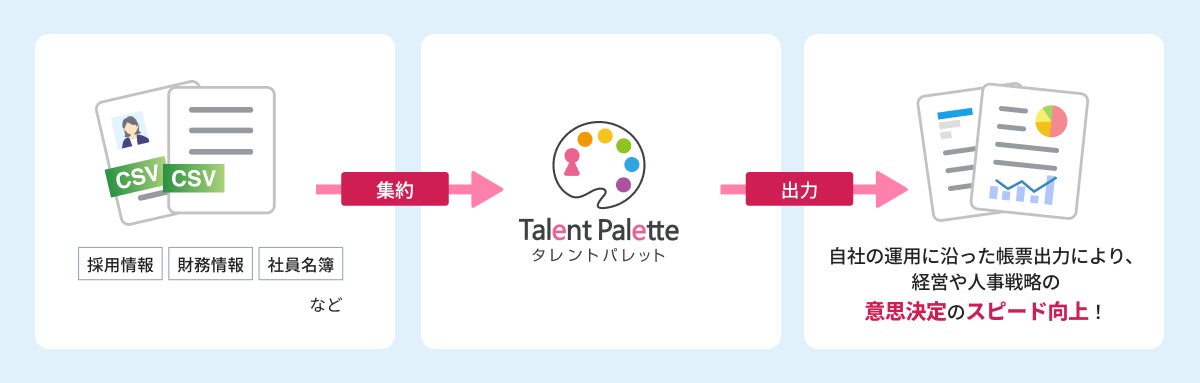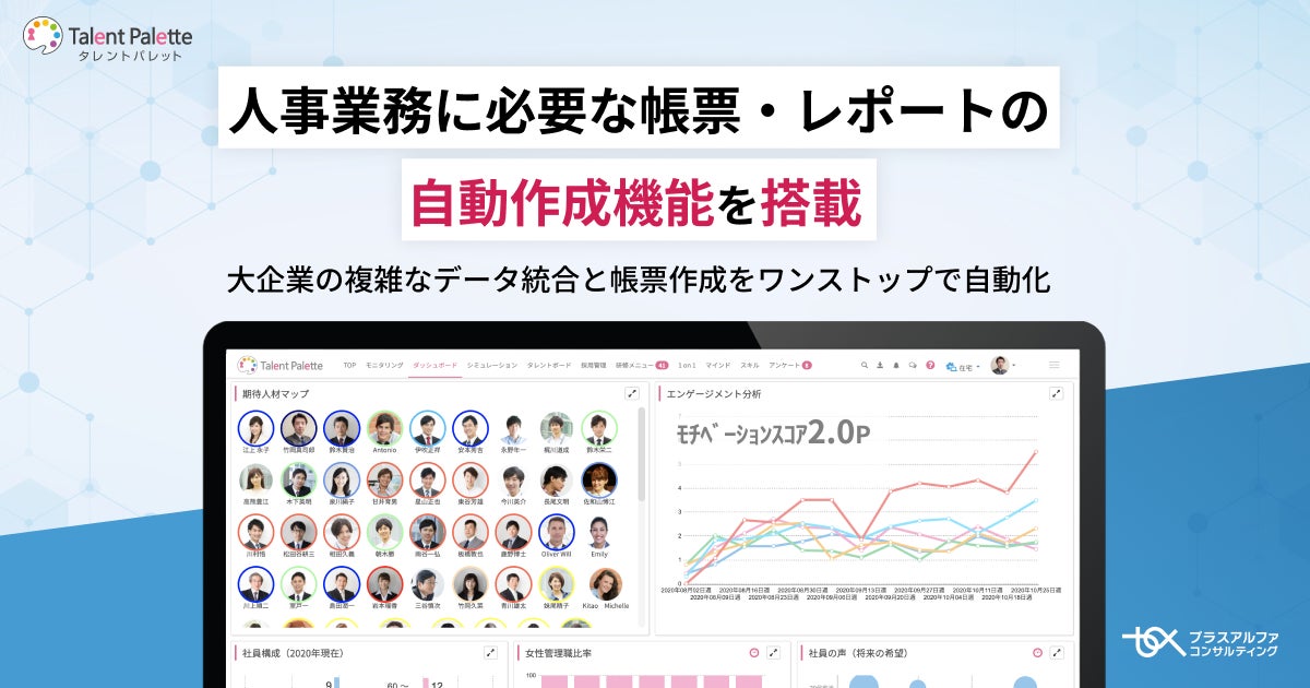 株式会社プラスアルファ・コンサルティング(本社:東京都港区、代表取締役社長:三室克哉、証券コード4071)は、データに基づく人材活用や人的資本の開示、人事業務のDX化、リスキリングの推進などを目的に、多くの企業で導入が進んでいるタレントマネジメントシステム「Talent Palette(以下:タレントパレット)」に、大企業向けに複雑なデータ統合や帳票レイアウトの作成、出力をワンストップで自動化する「帳票レポート自動作成機能」を搭載することをお知らせいたします。
