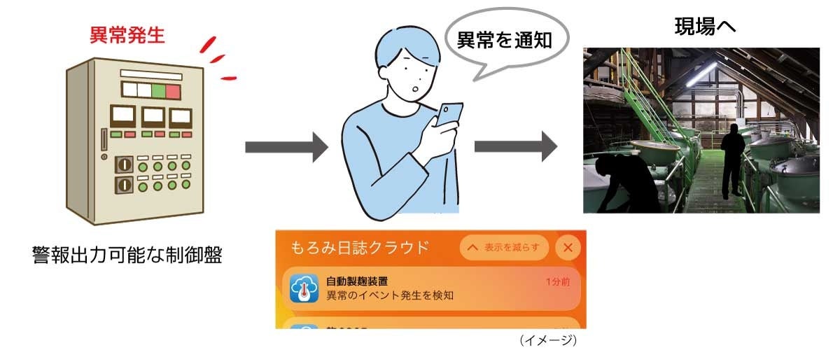 酒造現場には、さまざまな制御機器があります。たとえば品温は常時管理する必要があり、装置に異常が発生した際には迅速な対応が求められます。しかしながら、その場から離れていたり、夜間、休日だと異常に気づくことができません。そこで、警報を出力できる制御盤からの信号を受け取れるハードウェアを新たに開発しました。警報が発せられると、もろみ日誌クラウドを介してスマホやメールで通知する機能を実現します。通知ではどの制御機器で異常が発生しているかをお知らせします。