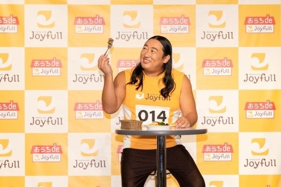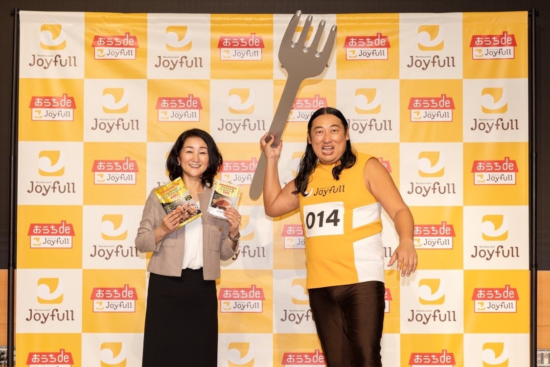 「巨大フォーク始投式」と題し、ロバート秋山さんが巨大フォークを投げた後、「おうちでジョイフルー!!」と大絶叫。会場は、笑いに包まれました。また、ロバート秋山さんは、「おうちdeジョイフル」のハンバーグを試食し「たのしうまい!!」とコメントしました。