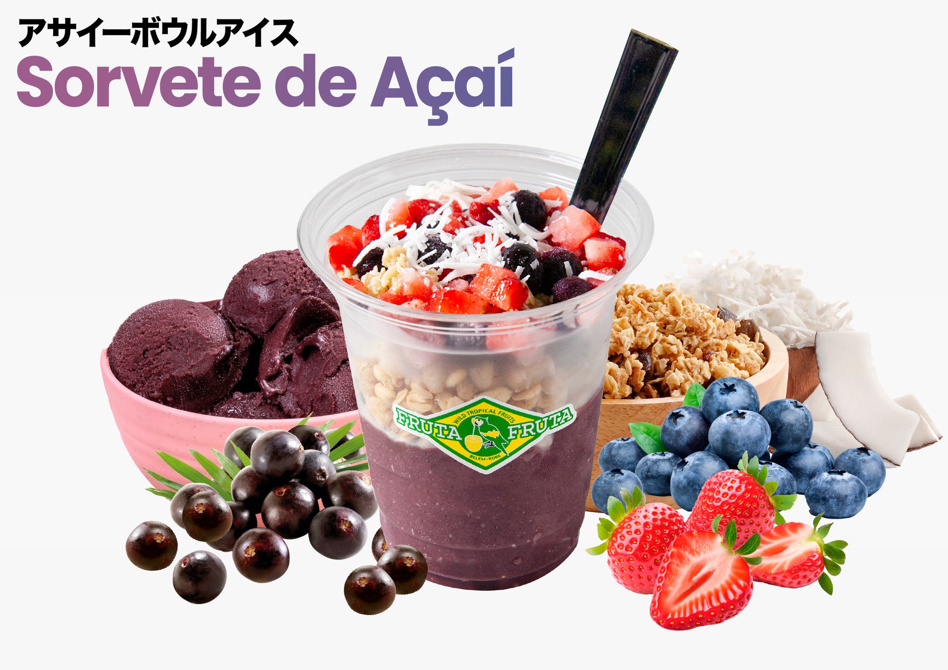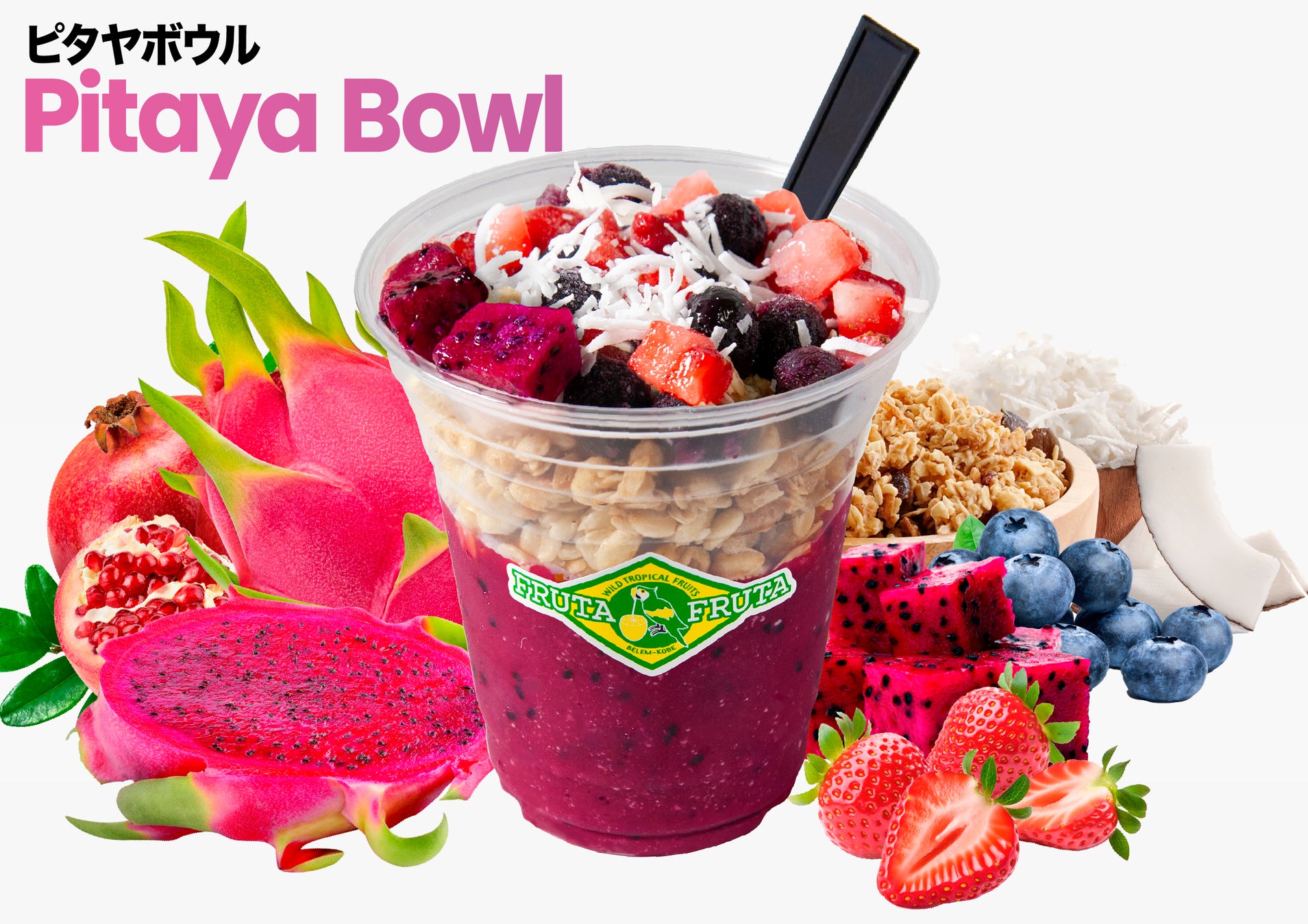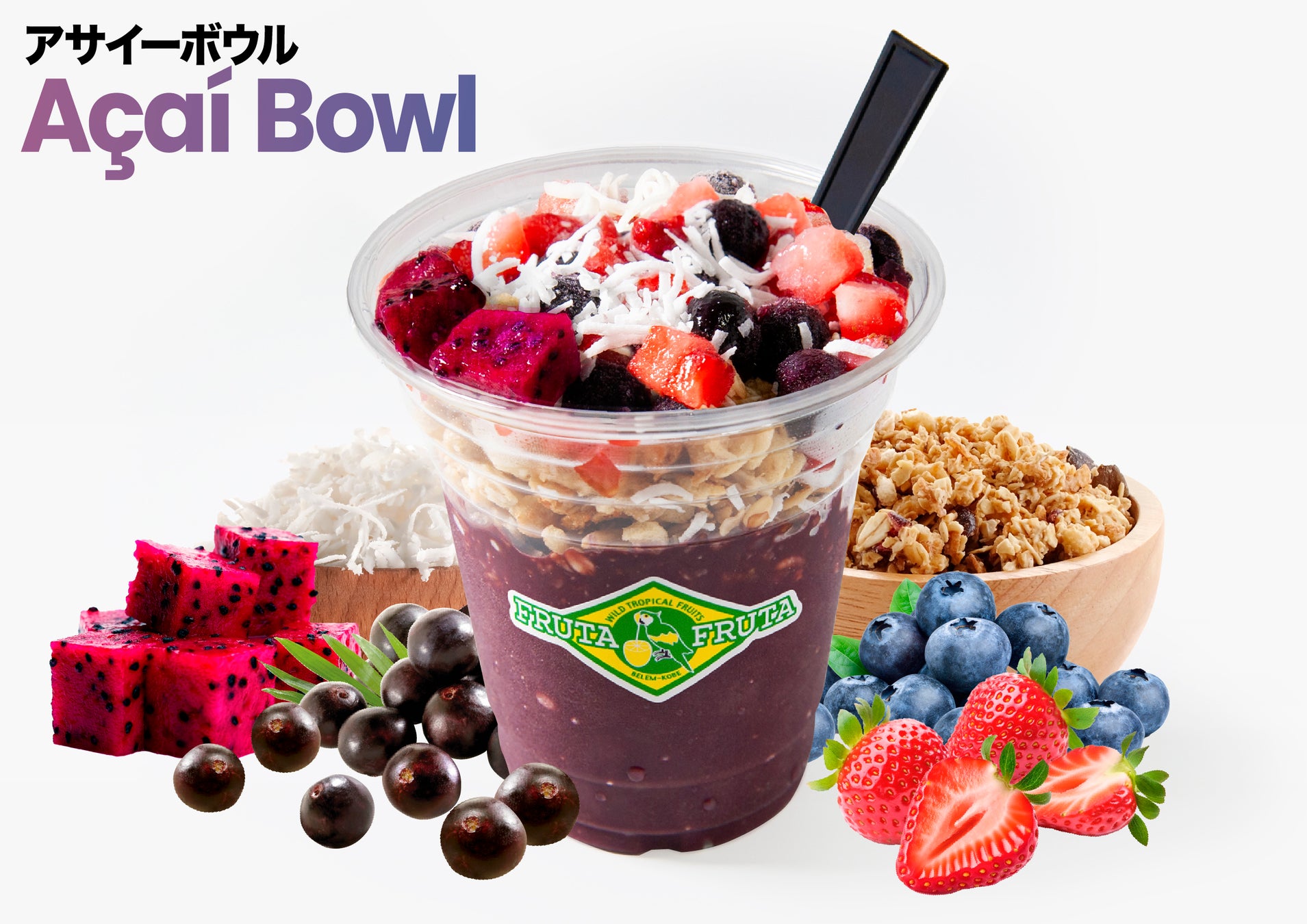 人気のアサイーをふんだんに使ったフルッタフルッタ特製の本格濃厚アサイーボウル。アサイーの美味しさを活かしたこだわり配合のスムージーをベースに、グラノーラと2種のベリーやココナッツフレークに、今年は色鮮やかなピタヤ(レッドドラゴンフルーツ)の果肉をトッピングしボリュームアップしました。食べ歩きし易いようにドリンクカップに盛りつけてご提供します。