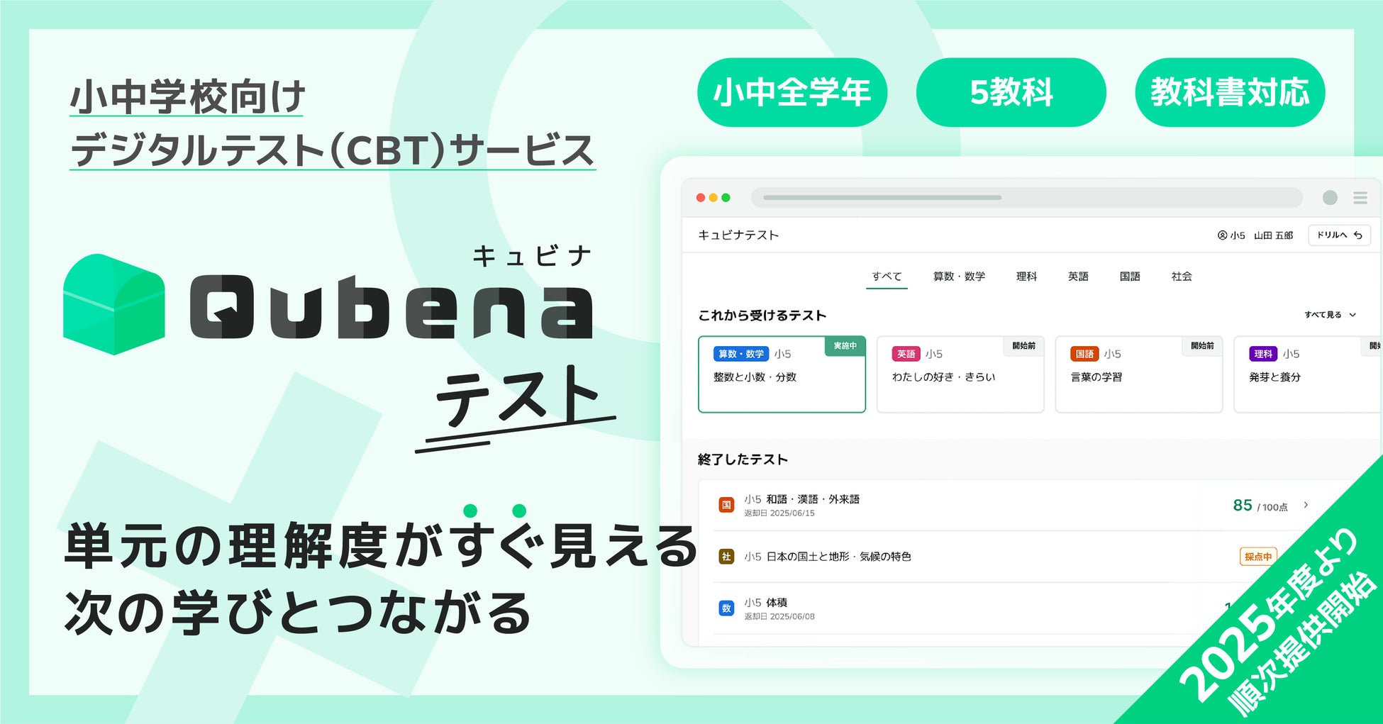このたび、そうした学校現場のCBT化への動きを加速し、これまでドリル教材としてのキュビナを軸に取り組んできた「個別最適で主体的な学び」および「先生方の業務負荷の軽減」を、テストの領域においても実現するため、小中学校向けデジタルテスト(CBT)サービス「キュビナ テスト」を新たに開発することになりました。今年度より順次提供開始を予定しております。