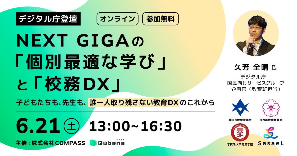 2025年6月21日(土)に開催するCOMPASS主催オンラインイベント“NEXT GIGAの「個別最適な学び」と「校務DX」”のプログラムの一つである「プロダクト・アップデート」にて、開発メンバーより「キュビナ テスト」についてご紹介いたします。下記イベント詳細をご確認いただき、ぜひお申し込みください。