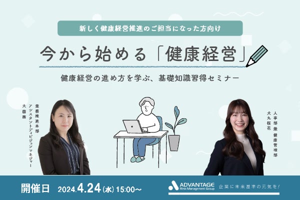 株式会社アドバンテッジリスクマネジメントは、2024年4月24日(水)に健康経営の実務担当者の方々を対象としたWebセミナー「今から始める健康経営~健康経営の進め方を学ぶ、基礎知識習得セミナー~」を開催いたします。