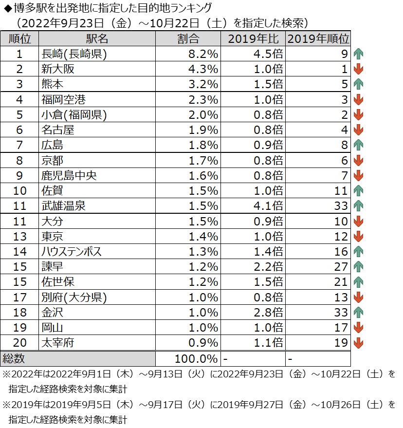 上記の調査対象を基に、博多駅を出発駅とした際の「目的駅」の検索結果を集計しました。