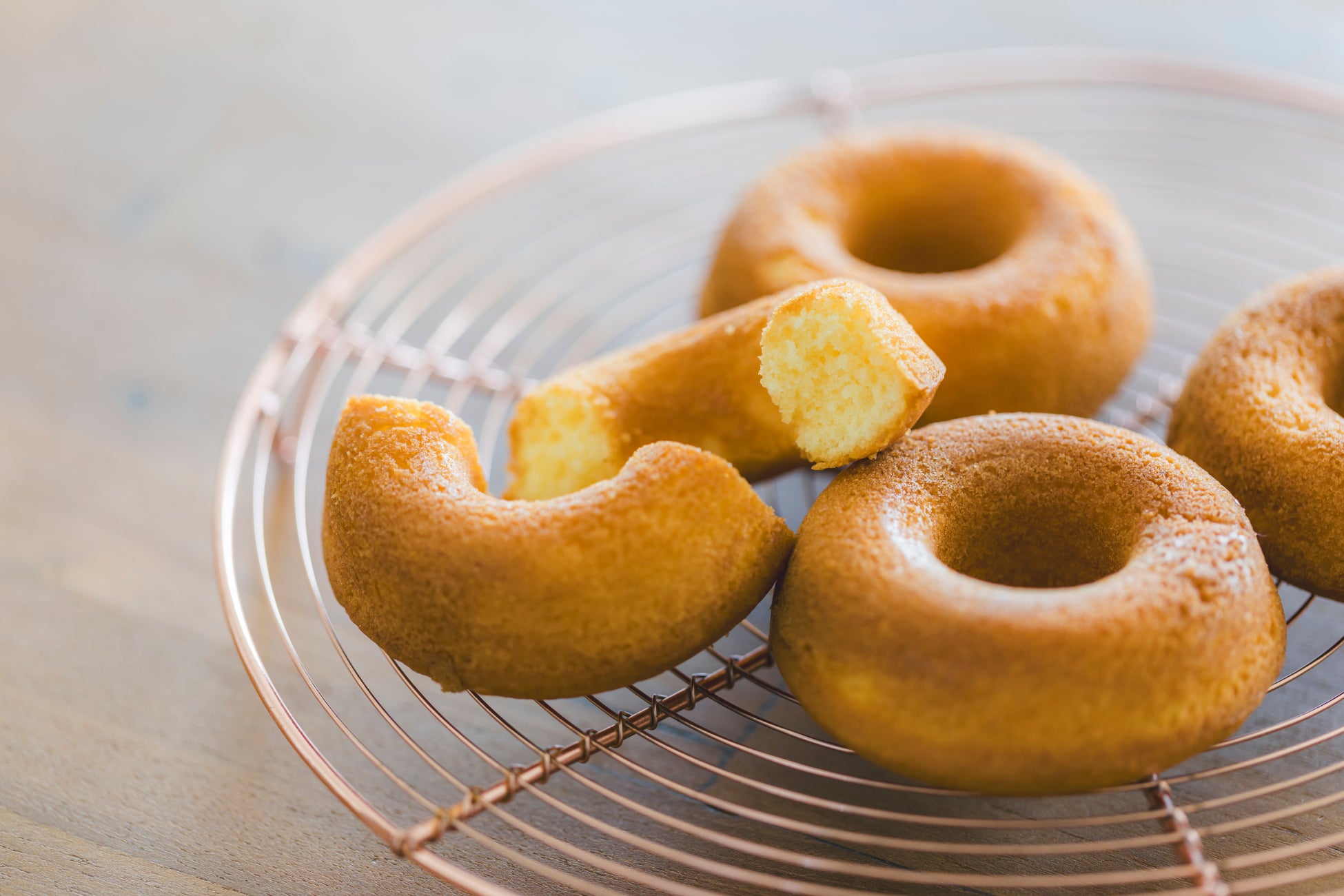 こめ油と米粉で作った焼きドーナツ。シンプルでやさしいドーナツは国産米粉100%で、素材の味を引き立てる製菓製パン用のこめ油を使うことでしっとりとした食感です。シンプルだけどコクのあるおいしさです。お子様のおやつにもオススメ!