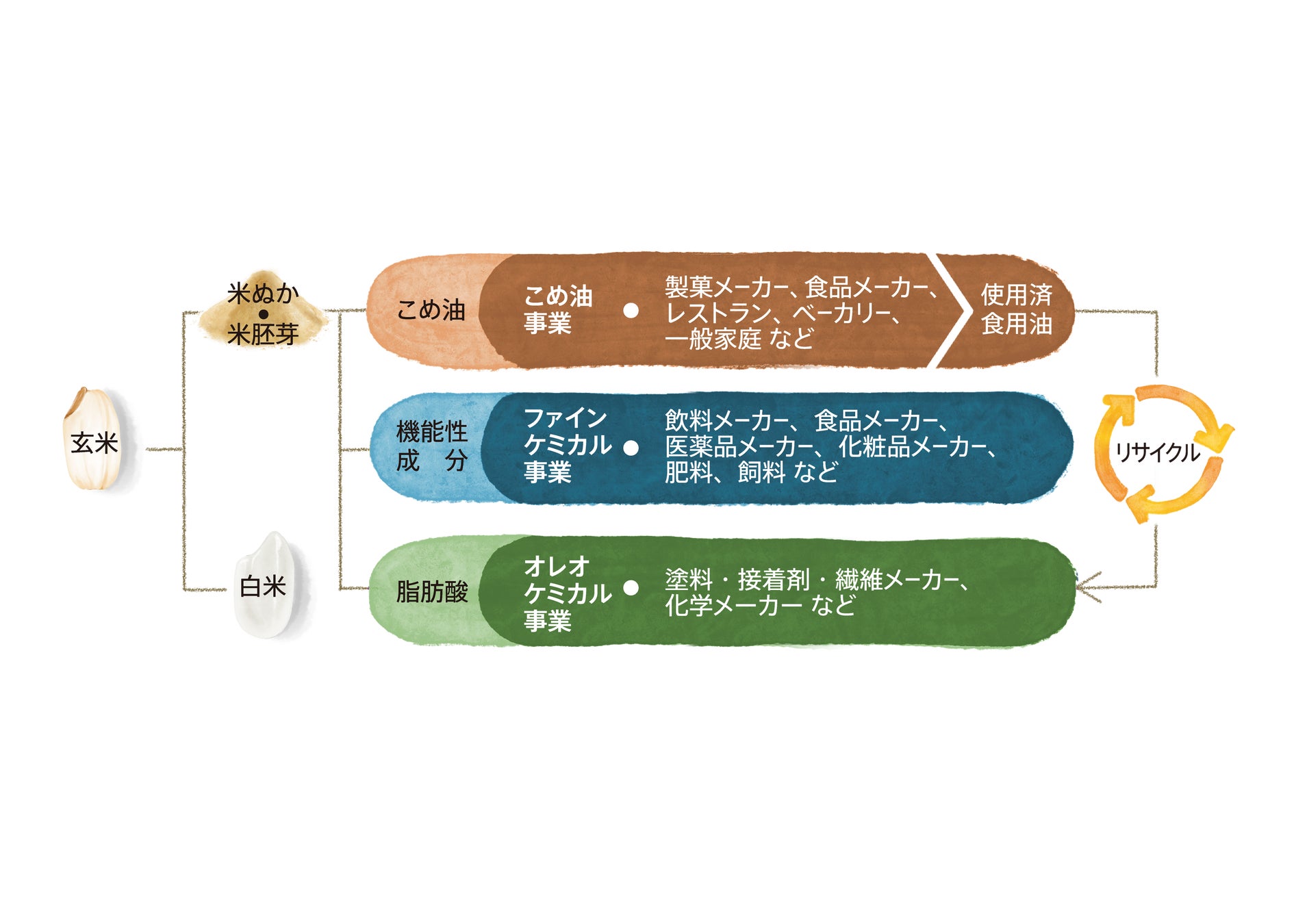 わたしたちは、古来健康と美のシンボルとして親しまれてきた“米ぬか”の高度有効利用を推し進め、「こめ油製造事業」「ファインケミカル事業」「オレオケミカル事業」の3つの事業を展開しています。