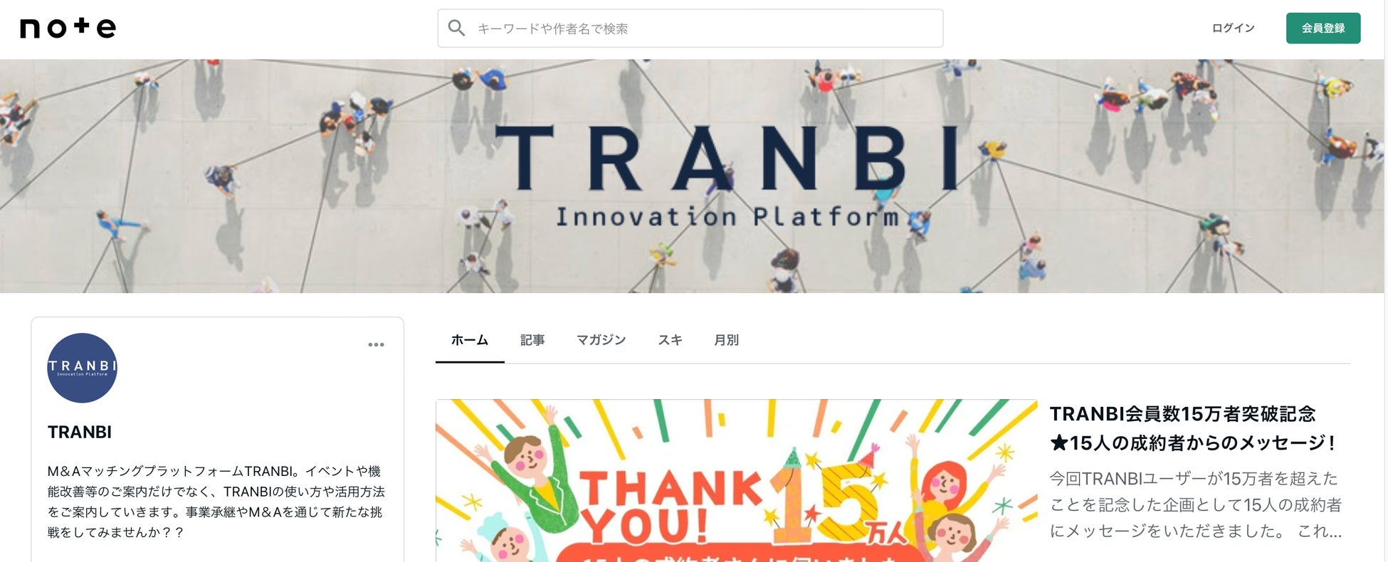 この度、日本最大級の事業承継・M&Aプラットフォームを運営する株式会社トランビ(本社:東京都港区、以下「トランビ」)は、2023年10月21日にユーザー数が15万者を突破し、ユーザーの皆様とのコミュニケーションをこれまで以上に図っていくことを目的として、公式note(https://note.com/tranbi)を立ち上げました。