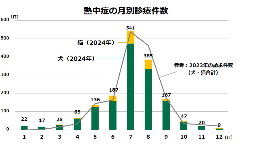 2024年の夏の平均気温は、1898年の統計開始以降、最も高かった2023年と並ぶ記録的な暑さだった(※2)こともあり、犬と猫あわせて7月に541件・8月に385件の熱中症による診療が発生しています。