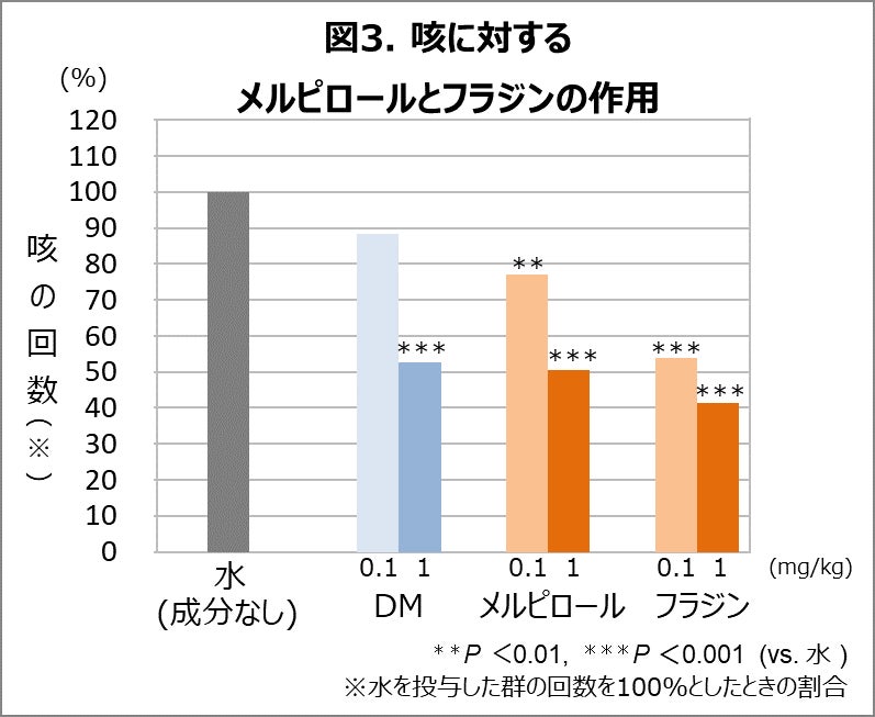 蜂蜜から単離精製できるメルピロールはごく微量なので、化学合成法を開発し、合成試料を用いて詳細に鎮咳活性を調べたところ、メルピロールとフラジンの群は、水を投与した群に比べて咳の回数が有意に減少し、その程度は鎮咳薬(DM)と同等以上であった (図3) 。