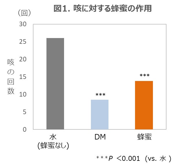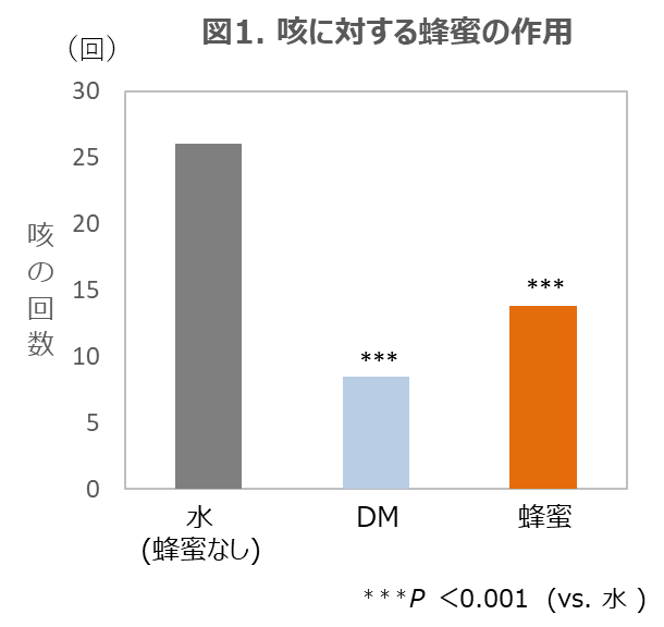 咳誘発モデルを用いた試験において、鎮咳薬(DM)と蜂蜜を投与した群では、水を投与した群に比べて、咳の回数が有意に減少した(図1)。蜂蜜は口からでなく胃内へ直接投与しているため、本研究における蜂蜜の鎮咳作用は、のどを潤すことによるものではないことが確認された。