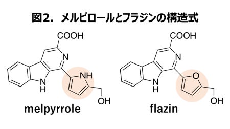 2つの成分を詳細に分析したところ、1つは「フラジン」であり、もう一方は、フラジンに構造が似た新規化合物※2であることが分かった。新規成分を、「メルピロール※3」と名づけた(図2)。