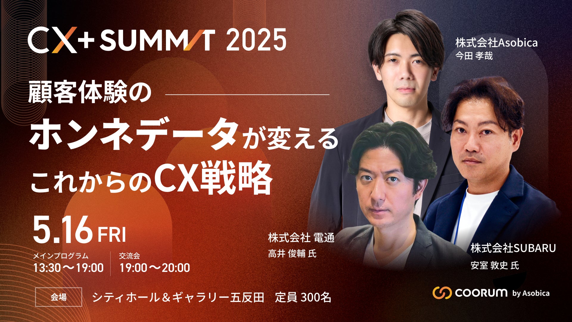 株式会社Asobica(本社所在地:東京都品川区、代表取締役CEO:今田 孝哉)は、5月16日(金)に開催した「CX+ Summit 2025」を、2025年7月8日(火)から7月10日(木)の3日間のみ視聴できる、オンライン配信を実施いたします。