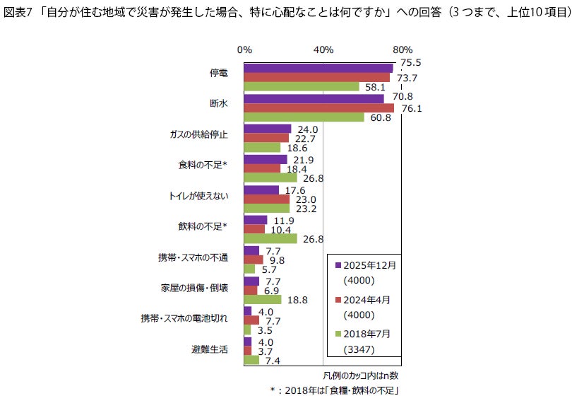 防災用物資の備蓄は、実際に災害が起きた時の心配事を反映するものでしょう。そこで、自分が住む地域で災害が発生したときに心配なことは何かを聞いた結果が図表7です。75.5%と4分の3の人が挙げたのが「停電」、これに4.7ポイント差で続くのが「断水」70.8%で、この2項目は他を大きく引き離しました。同じライフラインでも「ガスの供給停止」は24.0%にとどまっているのとは対照的です。時系列でみると、2018・2024年は1位「断水」、2位「停電」だったのが、今回は入れ替わっているのが興味深いところです。図表6で「飲料水」を備蓄している人が9割を超えたように、水に関しては備蓄が進んでいるほか、給水車の出動も考えられます。ですが、電気は発電機やバッテリーを非常用に備蓄しようと考えても、価格や置き場所などの点で現実的には難しい側面もありそうです。5位の「トイレが使えない」は、過去2回の調査では23%台だったのが今回は17.6%に低下したのは、少し意外な印象もあります。大規模災害のたびにトイレ問題が報道されることもあり、図表6で備蓄率が大幅に向上したこととも関連していそうです。
